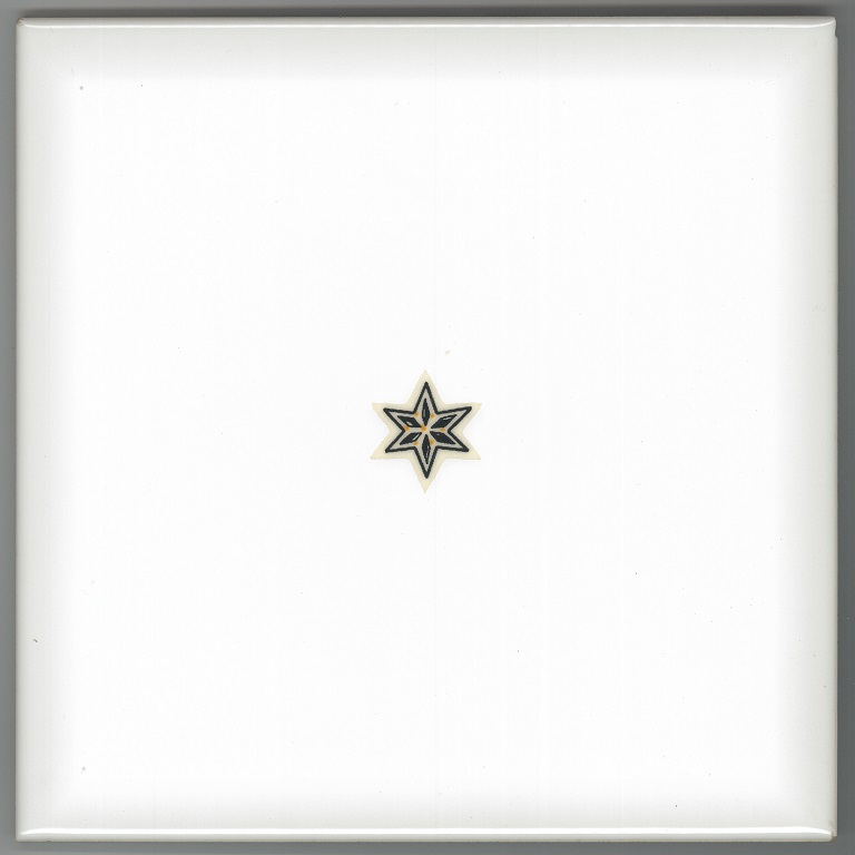 a: piastrella modello "Medea 1" dal supporto diamantata e smalto di fondo bianco lucido con decoro centrale di stella a sei punte ricavato per serigrafia a riserva e due colori. Sul retro impresso “5 | 16 91 | 3" e "made in Italy | (marchio azienda) | Cerdisa”, a pennarello “19.7.91 | H103”;
