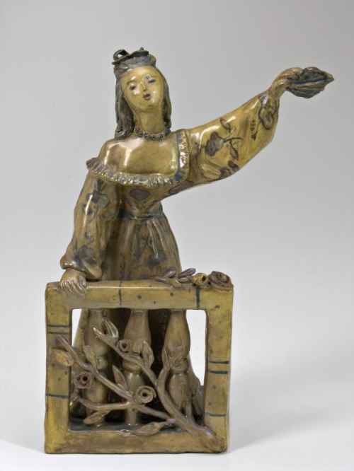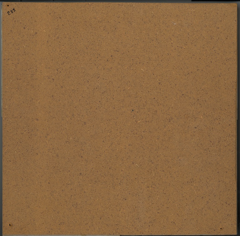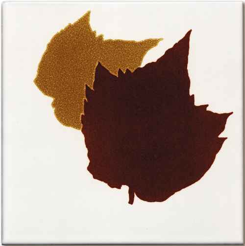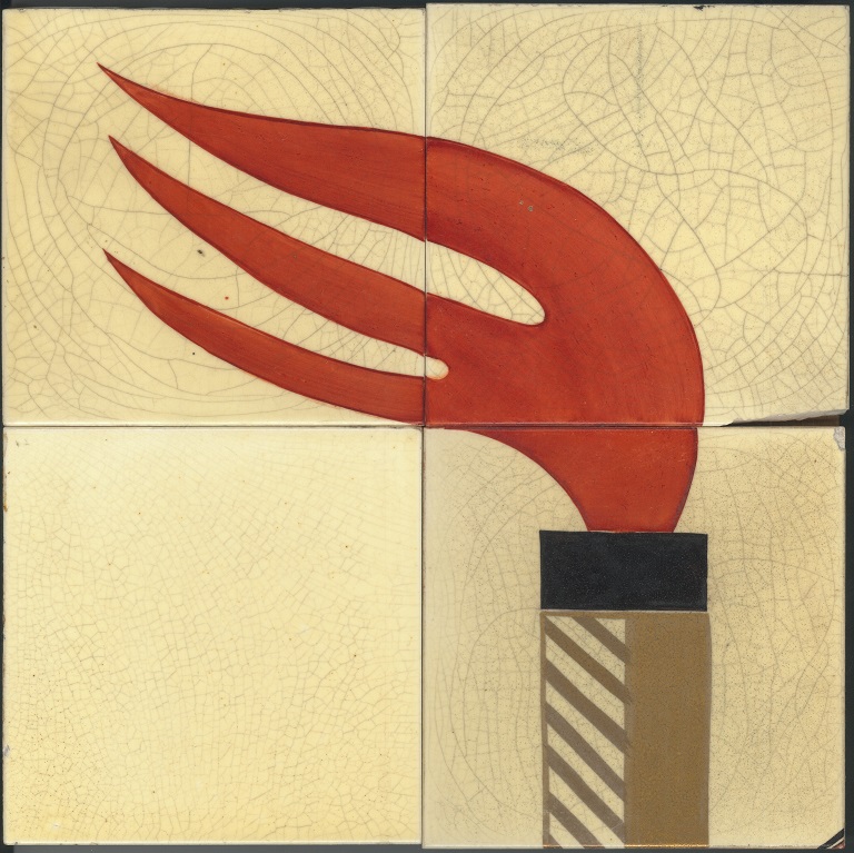 Pannello di quattro piastrelle montate su faesite. Fondo avorio satinato craquelè. Decoro di ciminiera con fiamma nei colori oro, nero e rosso.