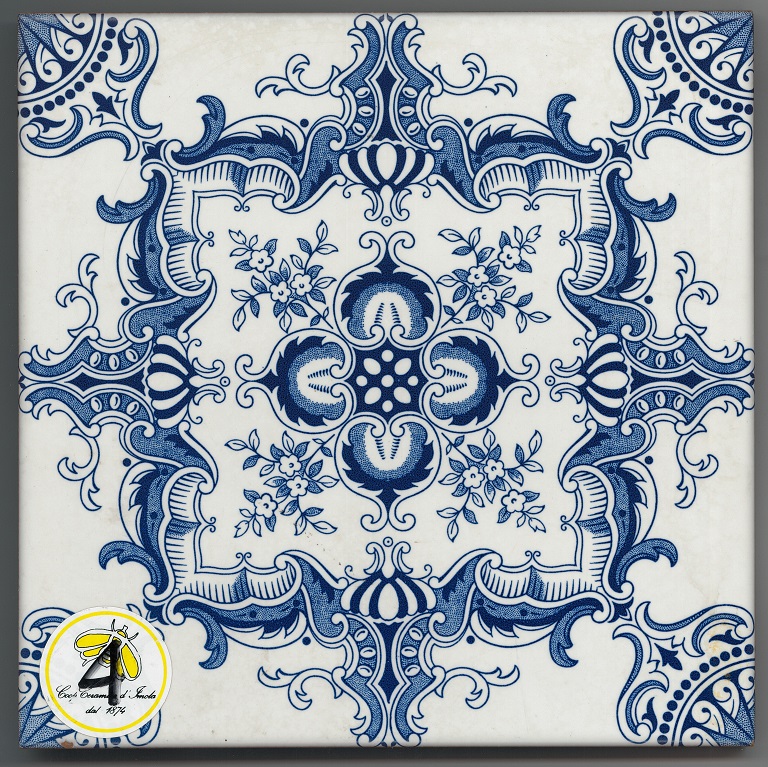 Piastrella modello "Olandese" dallo smalto di fondo bianco matt con decoro modulare floreale\geometrico in blu. Sul fronte presente etichetta circolare “(marchio azienda) | Coop. Ceramica d'Imola | dal 1874” sopra a pennarello numero “4”. Sul retro impresso entro cartiglio circolare “ceramiche | semi | (marchio Iris) | gres | Iris” e “made | in | Italy” e “(nove pallini) 68 | P.16 T.2”.