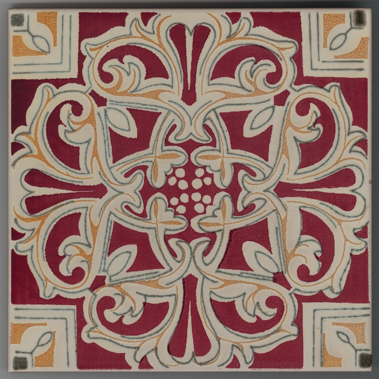 Piastrella dallo smalto di fondo avorio matt serigrafata con decoro geometrico\floreale in grigio, arancio e rosso. Sul retro impresso entro cartiglio quadrato “(marchio con lettera C)”, “made in Italy” e “A | 1”.
