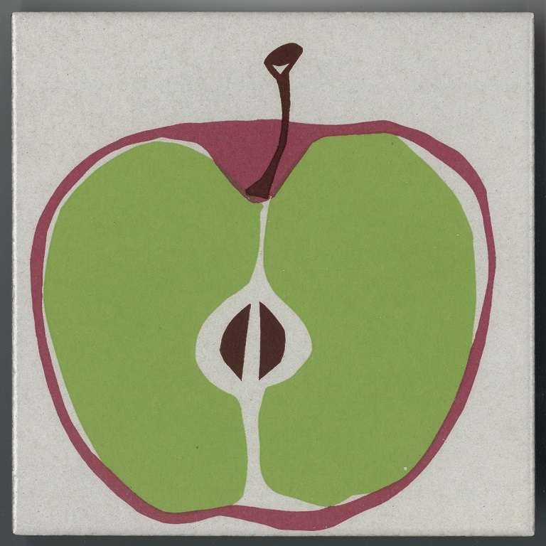 a: piastrella dal fondo bianco sporco con decoro di mela stilizzato in tre colori serigrafici. Sul retro impresso “Marazzi | s.p.a.", "(marchio azienda)", "atomar", "made in | Italy", “(otto pallini) 76 | P.11 T.8 | 30” e "jollytile | brevettato”;