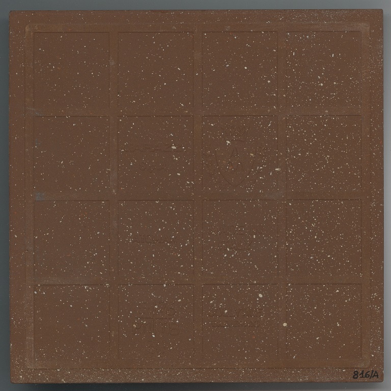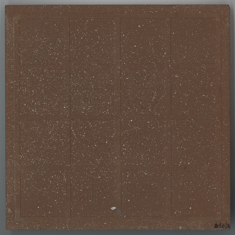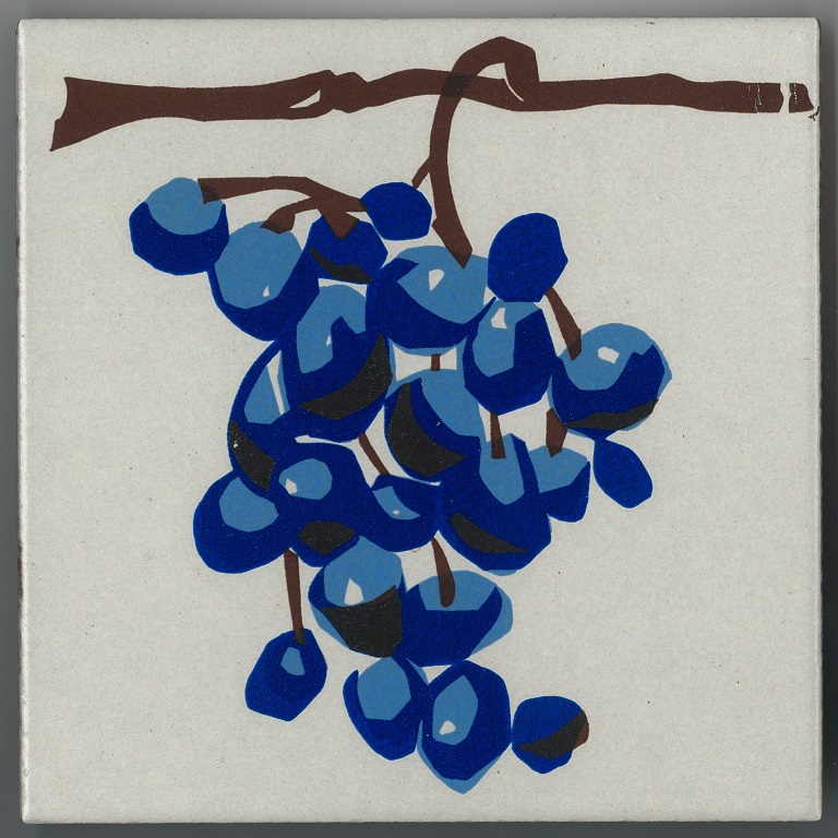 b: piastrella dal fondo biancastro con decoro di grappolo d'uva in tre colori serigrafici. Sul retro impresso “Marazzi | s.p.a.", "(marchio azienda)", "atomar", "made in | Italy", “(otto pallini) 76 | P.11 T.1 | 30” e "jollytile | brevettato”.