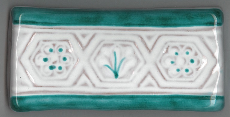 Listello modello "serie 100 verde ramina atelier", per cornice foggiato allo stato plastico, strutturato in bassorilievo con decori geometrici su fondo con smalto bianco e pennellate in verde. Sul retro impresso “Mutina | made in Italy”.