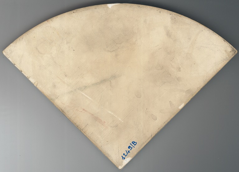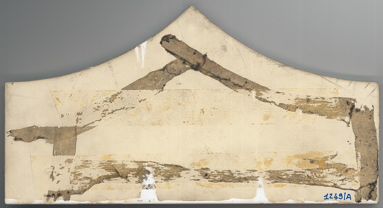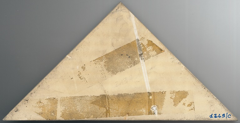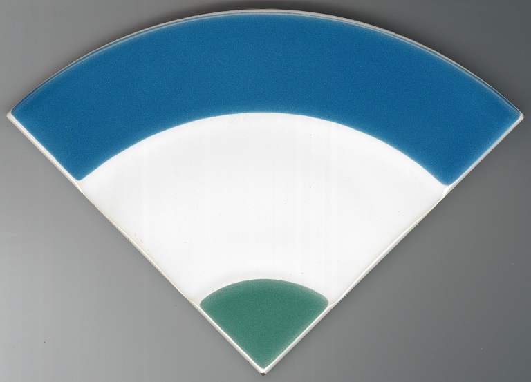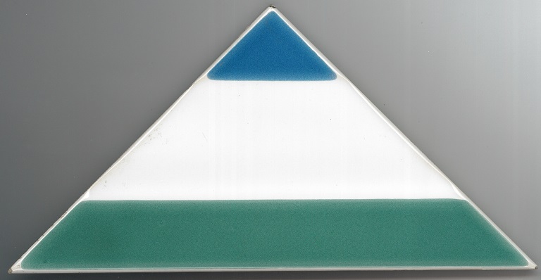 c: pezzo speciale a forma triangolare dallo smalto di fondo bianco lucido decorato con fasce verdi e blu.