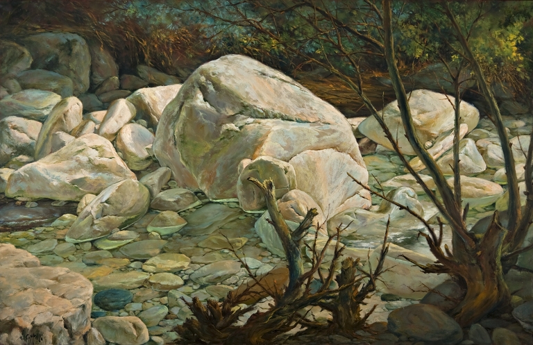 Il dipinto raffigura un tratto del torrente Aviana dopo una piena: tra la vegetazione bruna sullo sfondo e legni secchi in primo piano spiccano ciottoli, sassi, grandi massi chiari e l’acqua limpida del torrente.