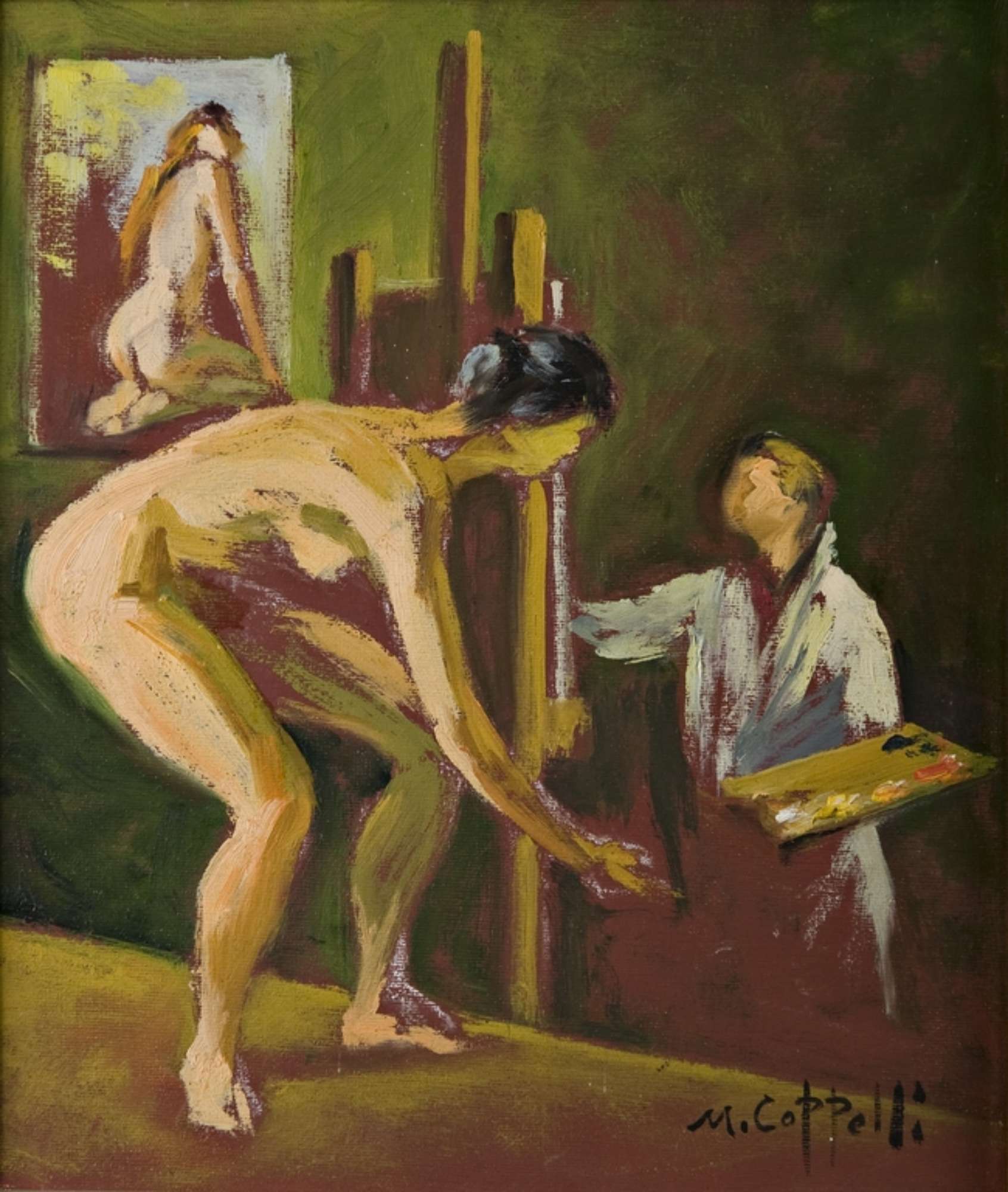 Bozzetto in cui sono raffigurati un pittore di fronte alla tela, con tavolozza e pennello, e una modella in posa.
