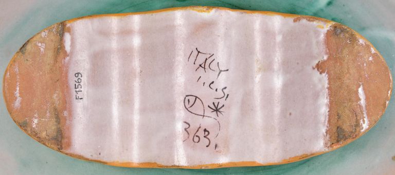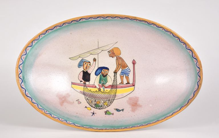 Sul recto, al centro, è raffigurata una scena di pesca con tre pescatori in barca a vela, intenti ad issare dal mare una rete piena di pesci. Il bordo è ornato da una linea sinuosa puntinata. Dipinta in policromia. Nel verso, al centro del piede, "ITALY / I.C.S. / asterisco / pesciolino stilizzato / 363."