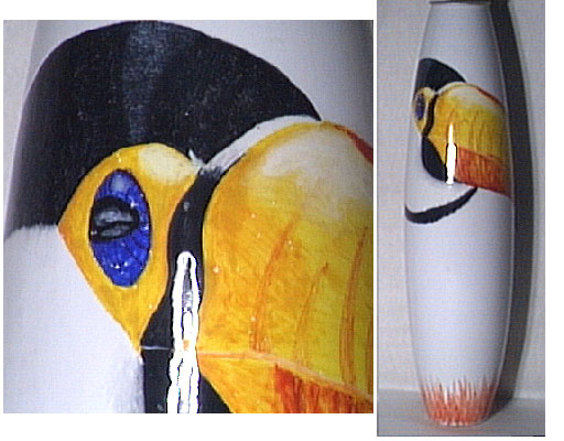 Vaso in terracotta smaltata (maiolica) con uccello dal grande becco. Superficie: smaltata e decorata.