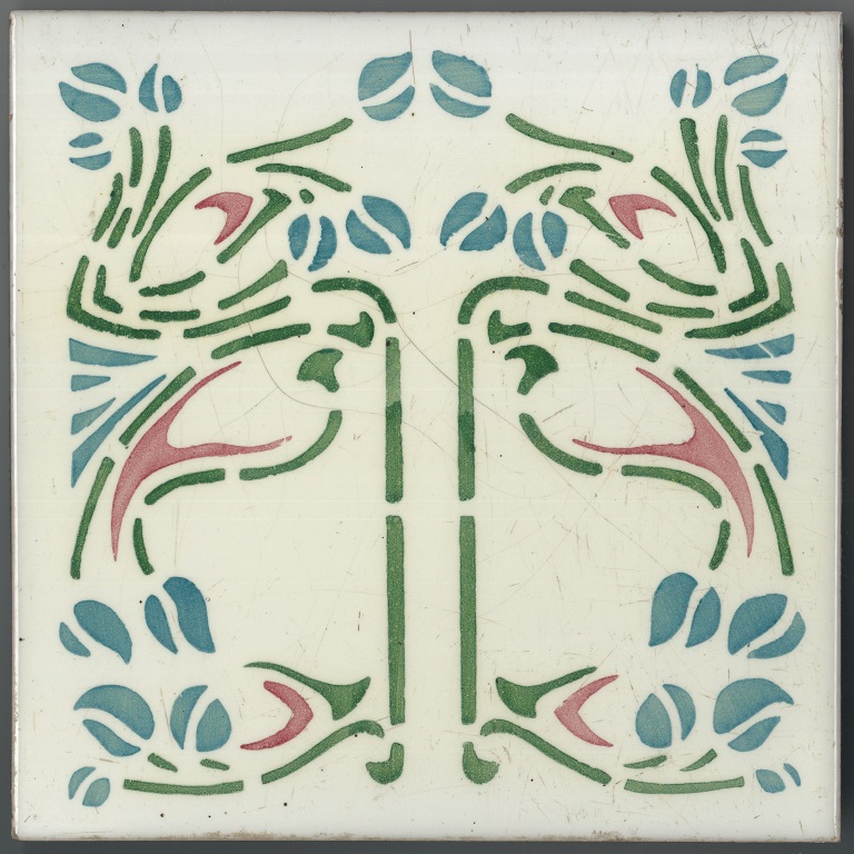 Piastrella rivestita di smalto bianco lucido e decorata a pennello con mascherine in tre colori. Disegno vegetale e di pavoni stilizzato. Sul retro impresso circolare entro stella a quattro punte parzialmente leggibile “[ceramica] Carani & Giglio[li] | V[eggia]”.