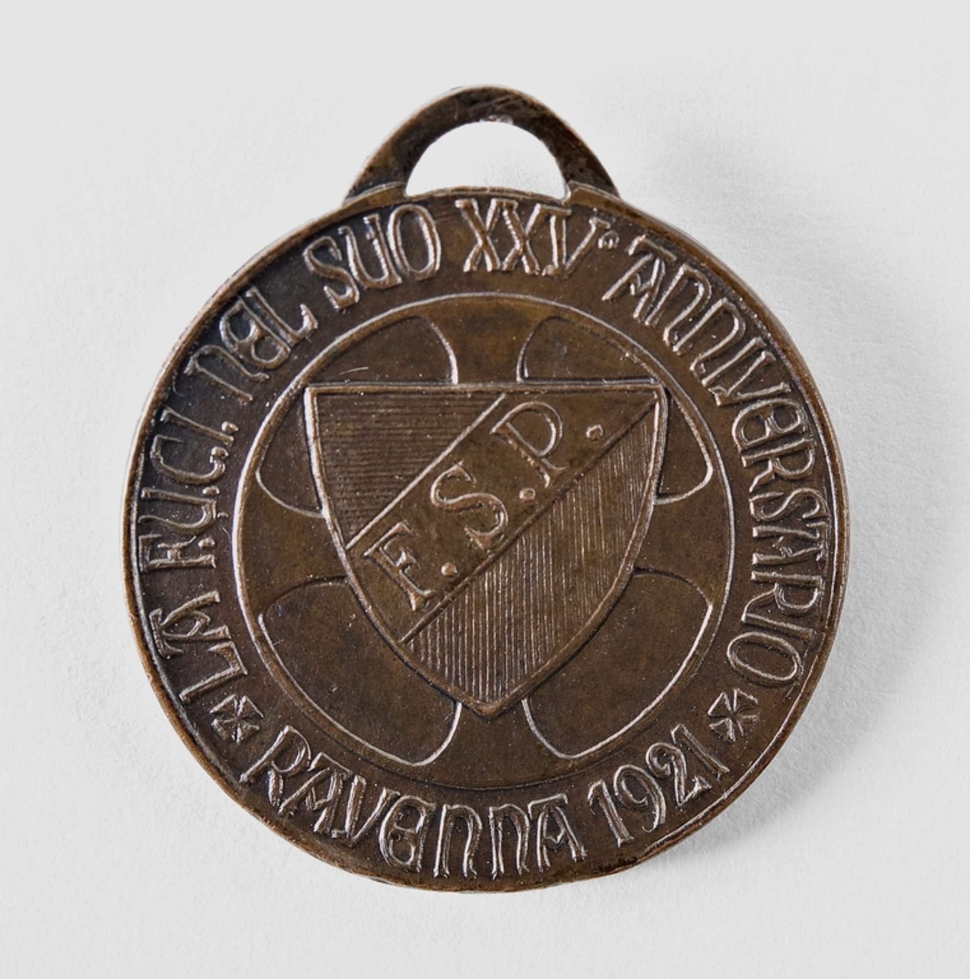Rovescio: nel campo, al centro, croce greca in parte coperta da uno stemma in cui sono le F.S.P., nel giro l'iscrizione "LA F.U.C.I. nel suo XXV° ANNIVERSARIO/RAVENNA 1921"
