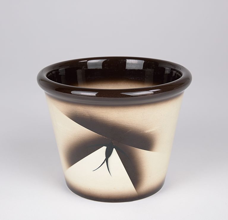 Cache-pot aerografato in bruno, decorato con una rondine di colore nero in volo. Base e bocca di colore bruno, interno chiaro.