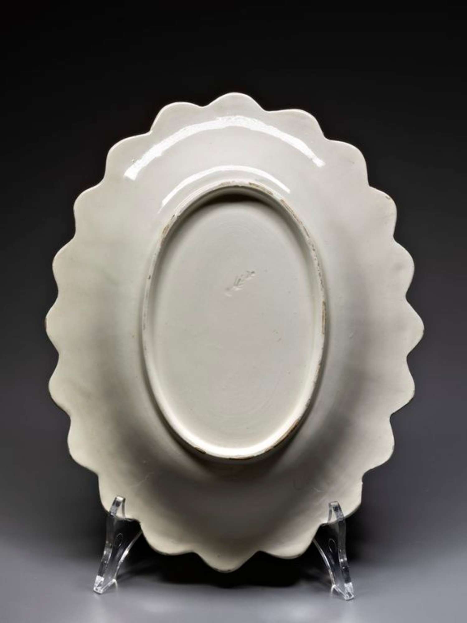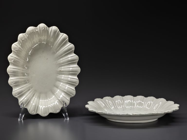 Coppia di crespine ovali percorse da baccellature radianti, orlo lobato, basso piede, senza decorazione.