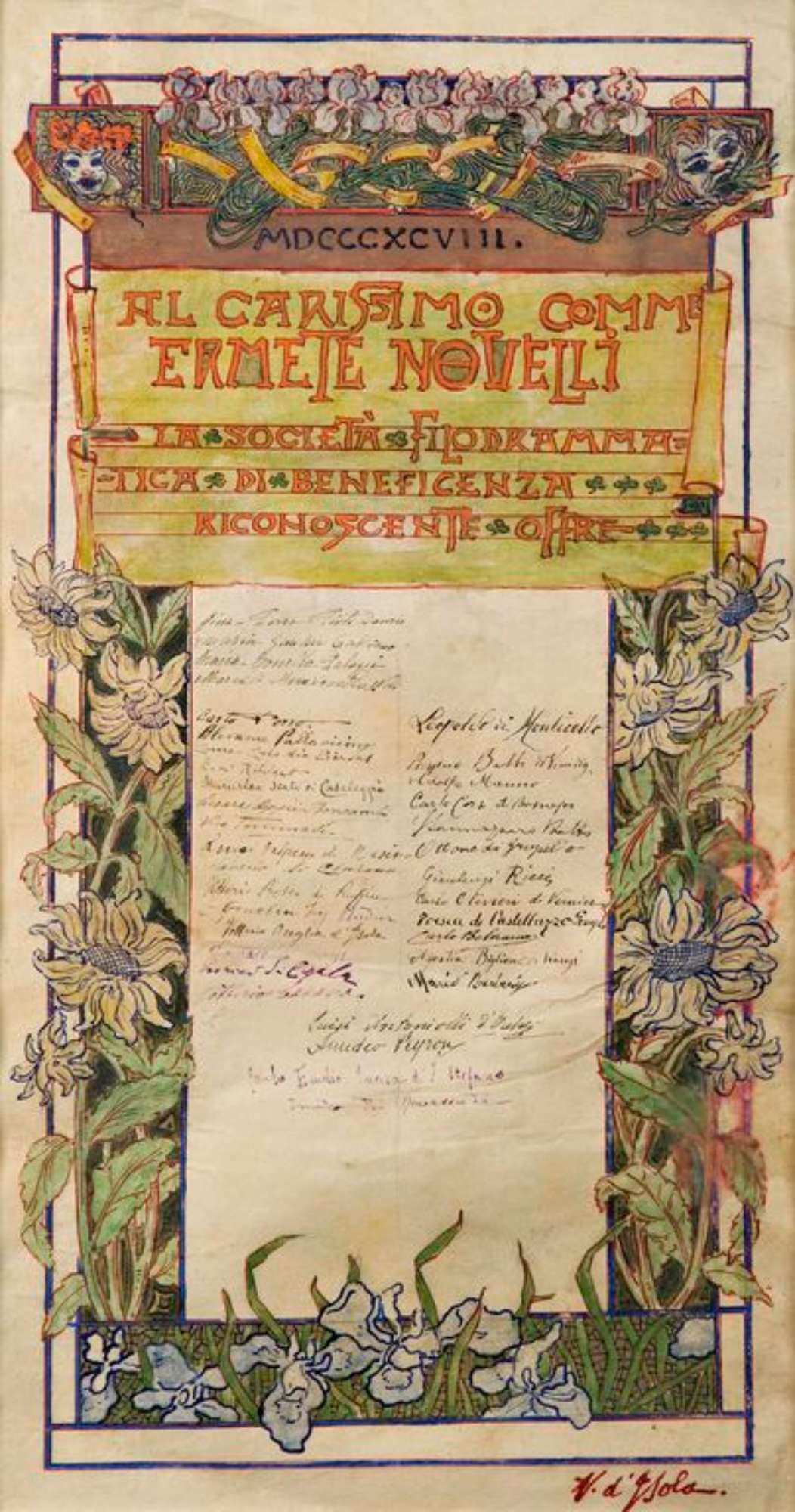 Pergamena che manifesta la riconoscenza ad Ermete Novelli della Società Filodrammatica di Beneficenza, con firme autografe dei dedicanti.