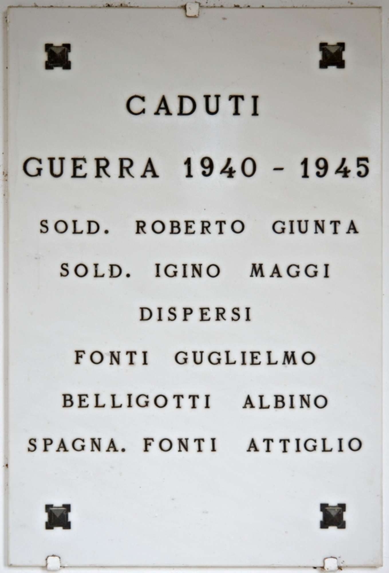 Il monumento ai caduti presenta le lapidi con i nomi dei concittadini deceduti durante la guerra del 1940-1945, aggiunte in un secondo tempo. Il monumento fu realizzato in seguito alla conclusione della Prima Guerra Mondiale e in qualche modo era una esortazione a giustificare le tantissime vittime italiane durante il conflitto, in virtù di una "Unità nazionale" che avrebbe dovuto portarci verso il superamento dei conflitti interni all'Italia e che invece ci portò prima nella braccia della dittatura fascista e poi in una Seconda Guerra Mondiale.