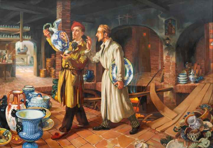 Xilografia su carta raffigurante una fornace dove si producono ceramiche. La fornace è costituita da due livelli di arcate che racchiudono nicchie, la parte centrale rimane aperta, solo una trave attraversa lo spazio vuoto; in basso, al centro, è rappresentato il forno dove un artigiano sta inserendo un manufatto per la cottura. Al livello superiore due operai trasportano ceramiche finite, da sistemare nelle nicchie dove sono già altri manufatti.