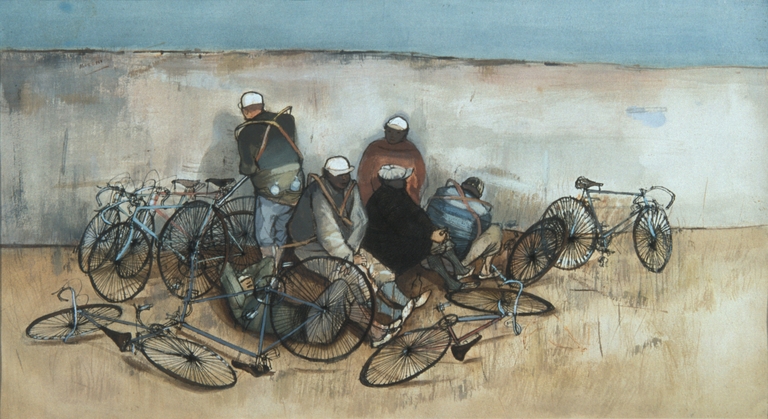 Acquerello su carta raffigurante un gruppo di ciclisti in sosta. Le figure sono tutte rappresentate al centro della scena, intorno sono posate le biciclette su un terreno neutro. Dietro il gruppo un semplice muretto grigio che fa da sfondo all'immagine.
