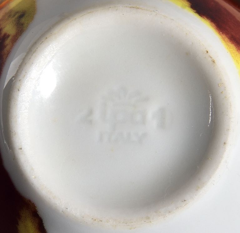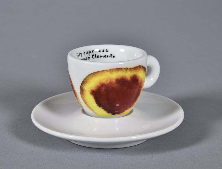 All'interno della tazzina, sul bordo, scritta in nero "illy espresso / Francesco Clemente". Esternamente è decorata con macchie di colore rosse al centro, che sfumano in giallo, per poi tornare rosse sul bordo.