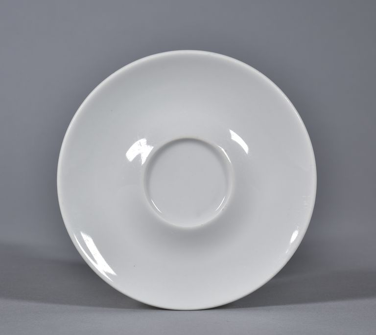 Piattino in porcellana bianca a parete leggermente svasata, cavetto al centro, con bordo rialzato, per l'appoggio della tazzina, su basso piede ad anello. Nel piede, marca "ipa", sormontata da una corona.