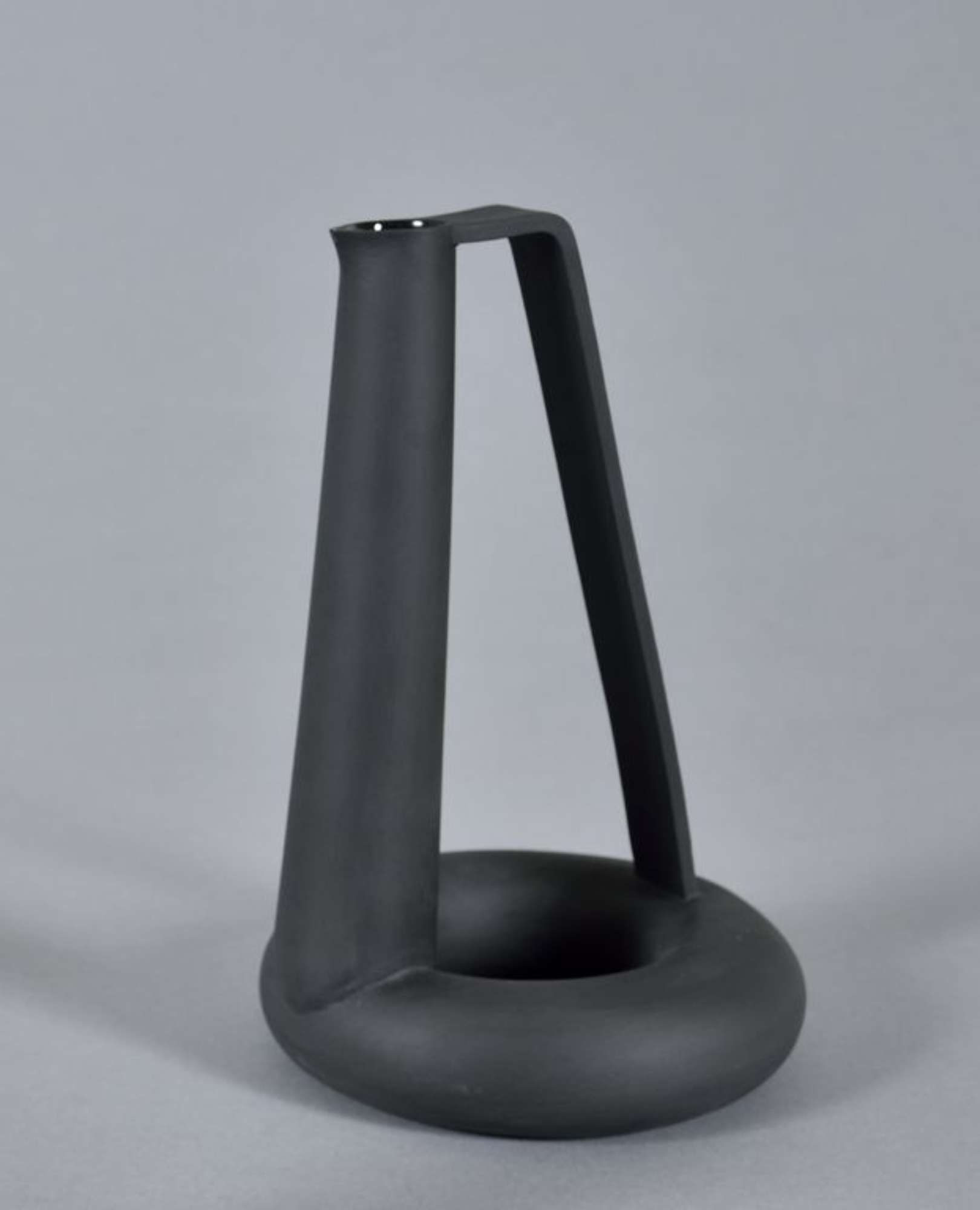 Versatoio a base circolare, cavo al centro, con alto e stretto tubetto versatore, collegato al manico a piatto. Colore nero opaco.