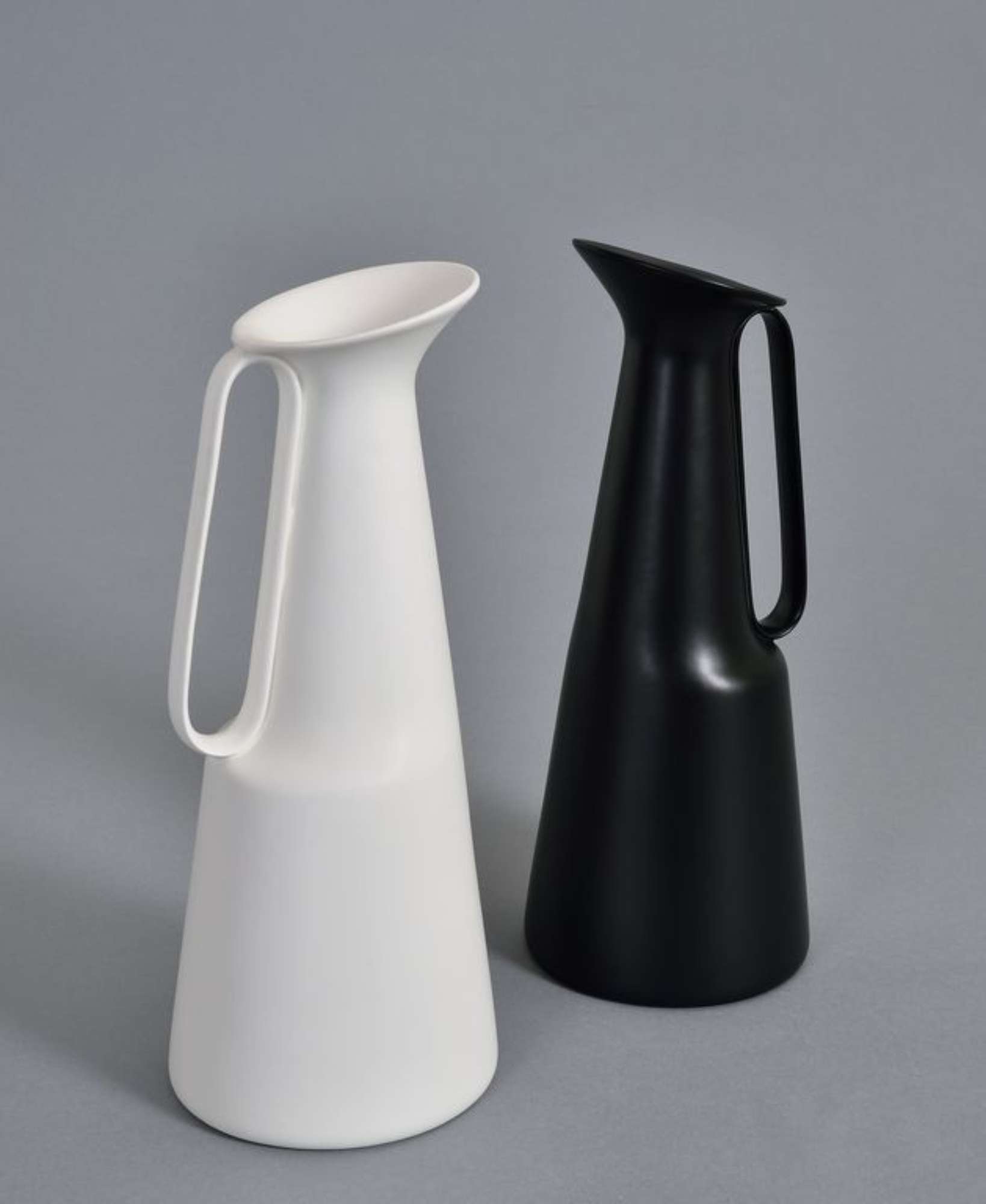 Caraffa a corpo conico, con bocca svasata e manico a nastro. Rivestimento nero opaco.