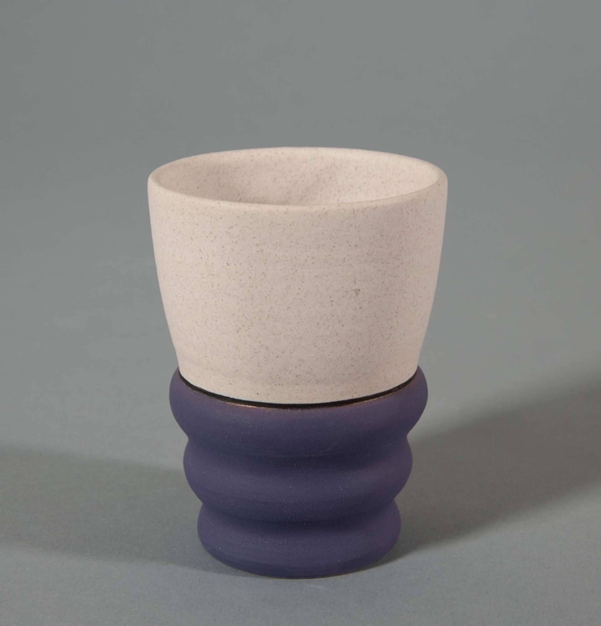 Bicchiere a forma conica, con parte inferiore modanata e smaltata in viola. Parte superiore smaltata in beige-rosato.