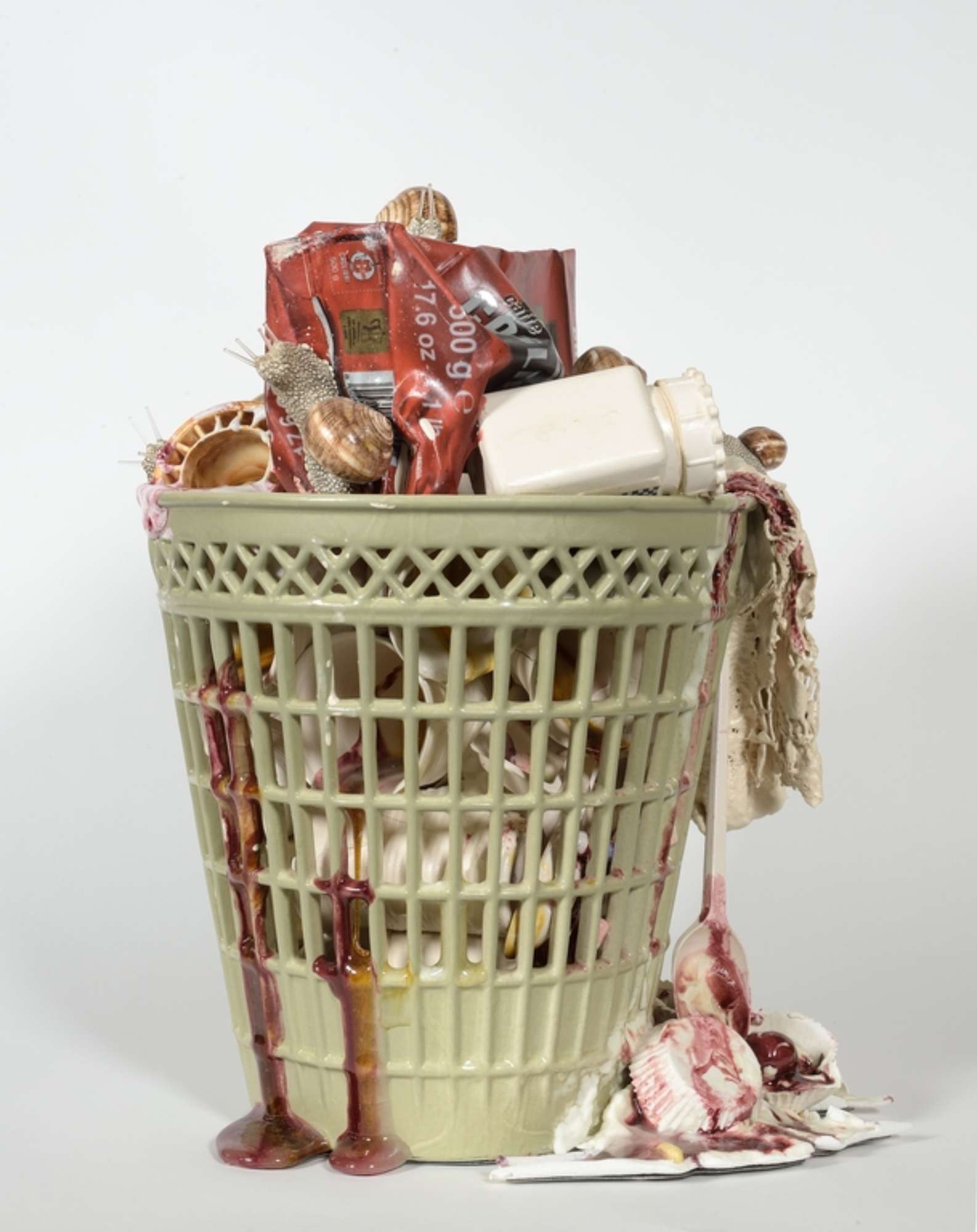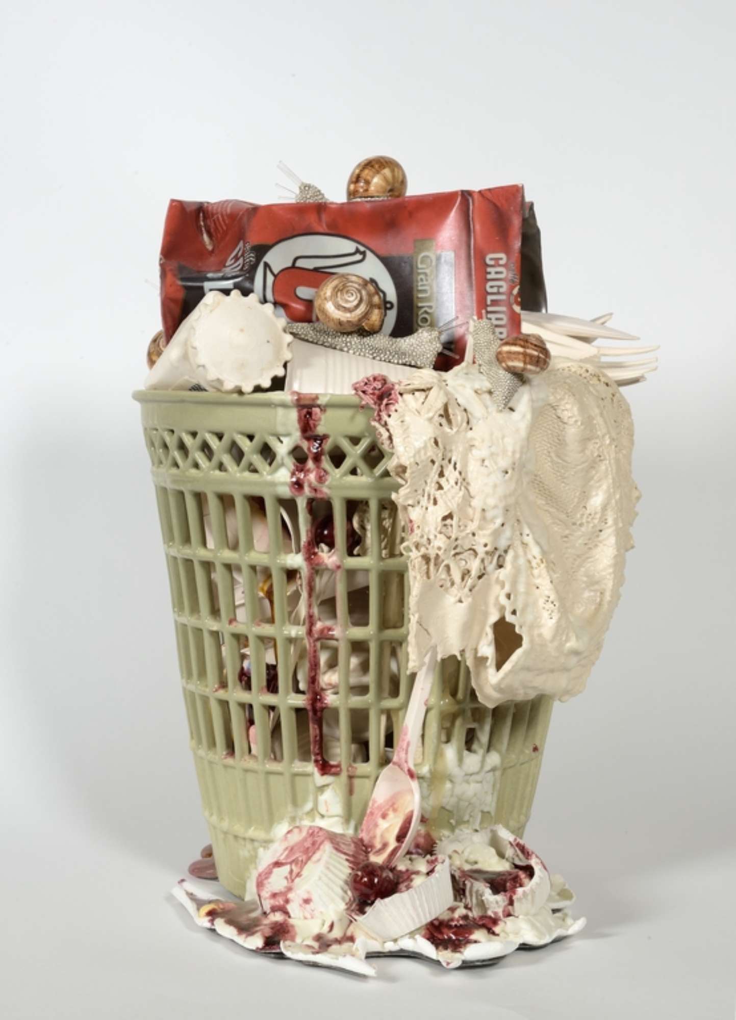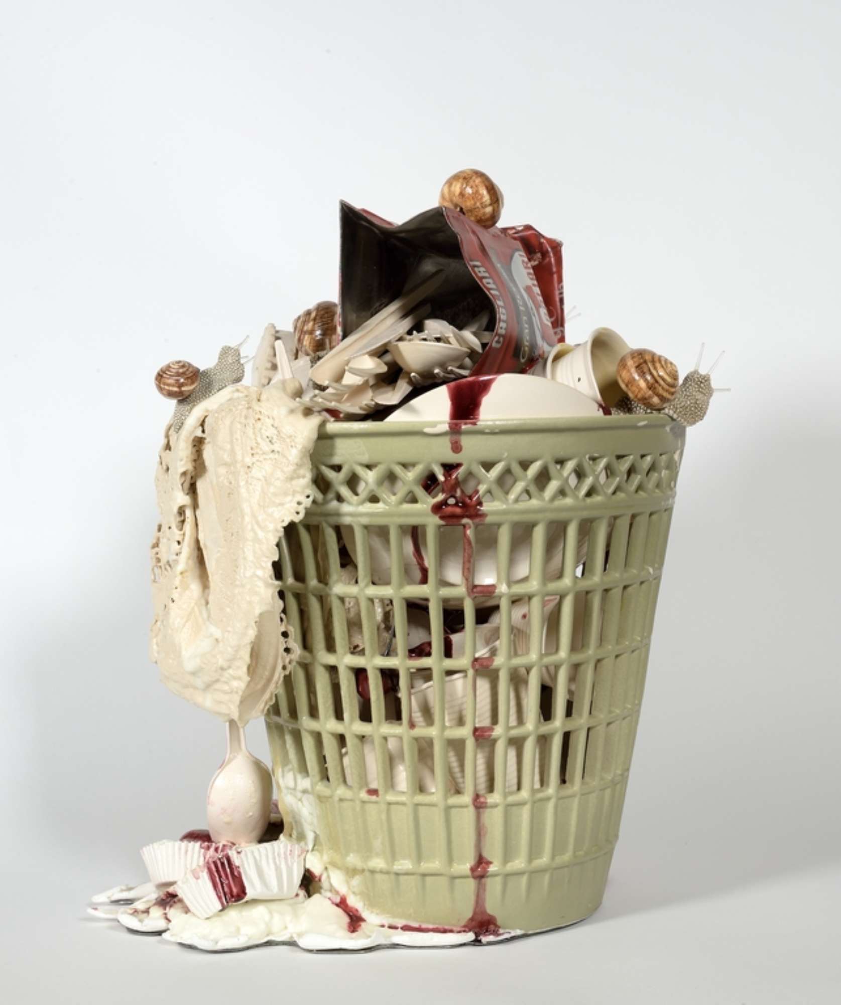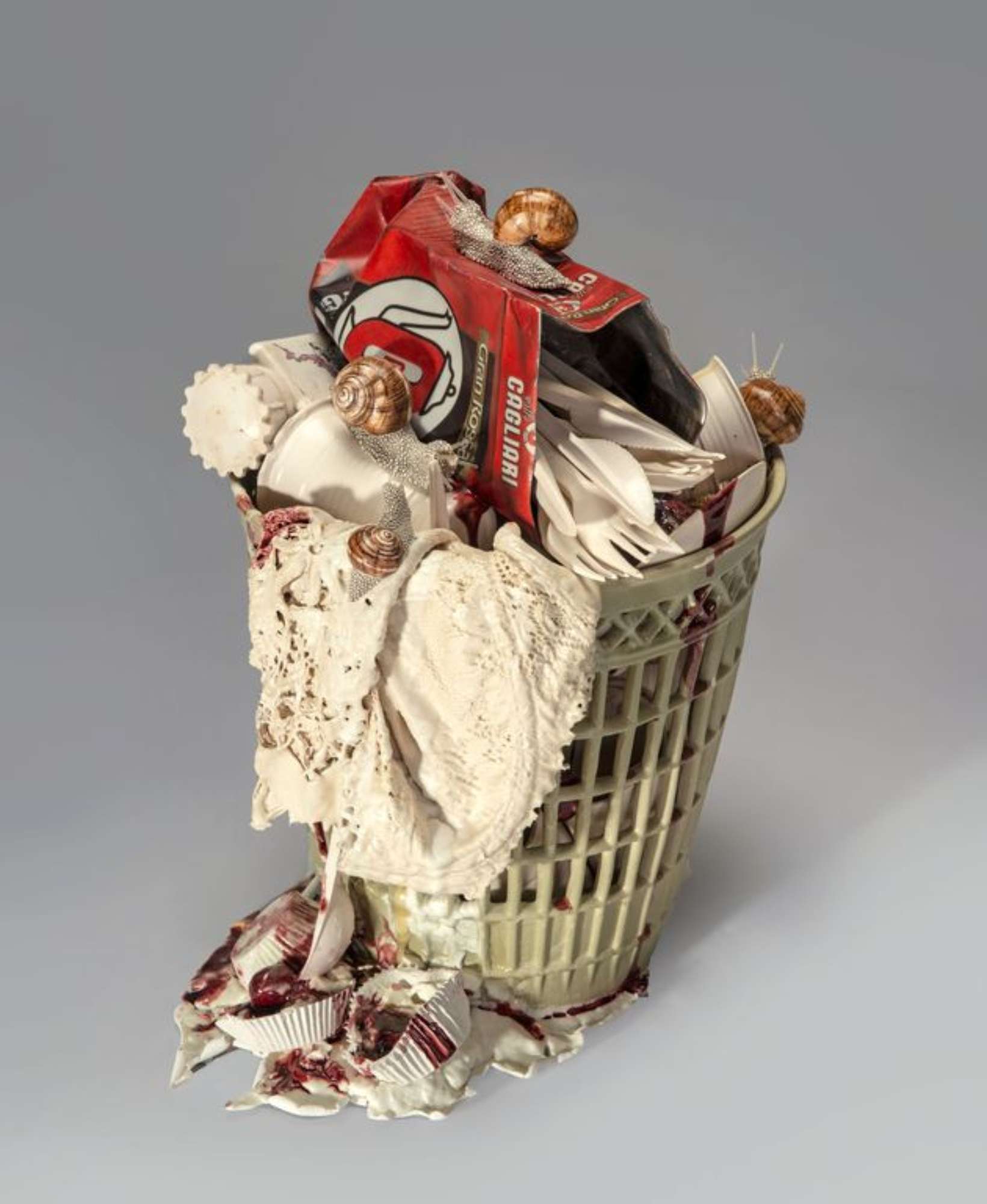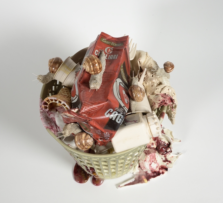 Cestino traforato pieno di rifiuti e lumache. Nel cestino sono riprodotti in ceramica un sacchetto di caffè con all'interno posate di plastica, bicchieri di plastica, un cono gelato, un piattino con gelato, una bottiglietta di plastica e una tovaglietta, sulle quali si posano delle lumache. Fuori dal cestino sono posti piccoli cestini di carta con residui di dolci con ciliegie. Terraglia policroma.