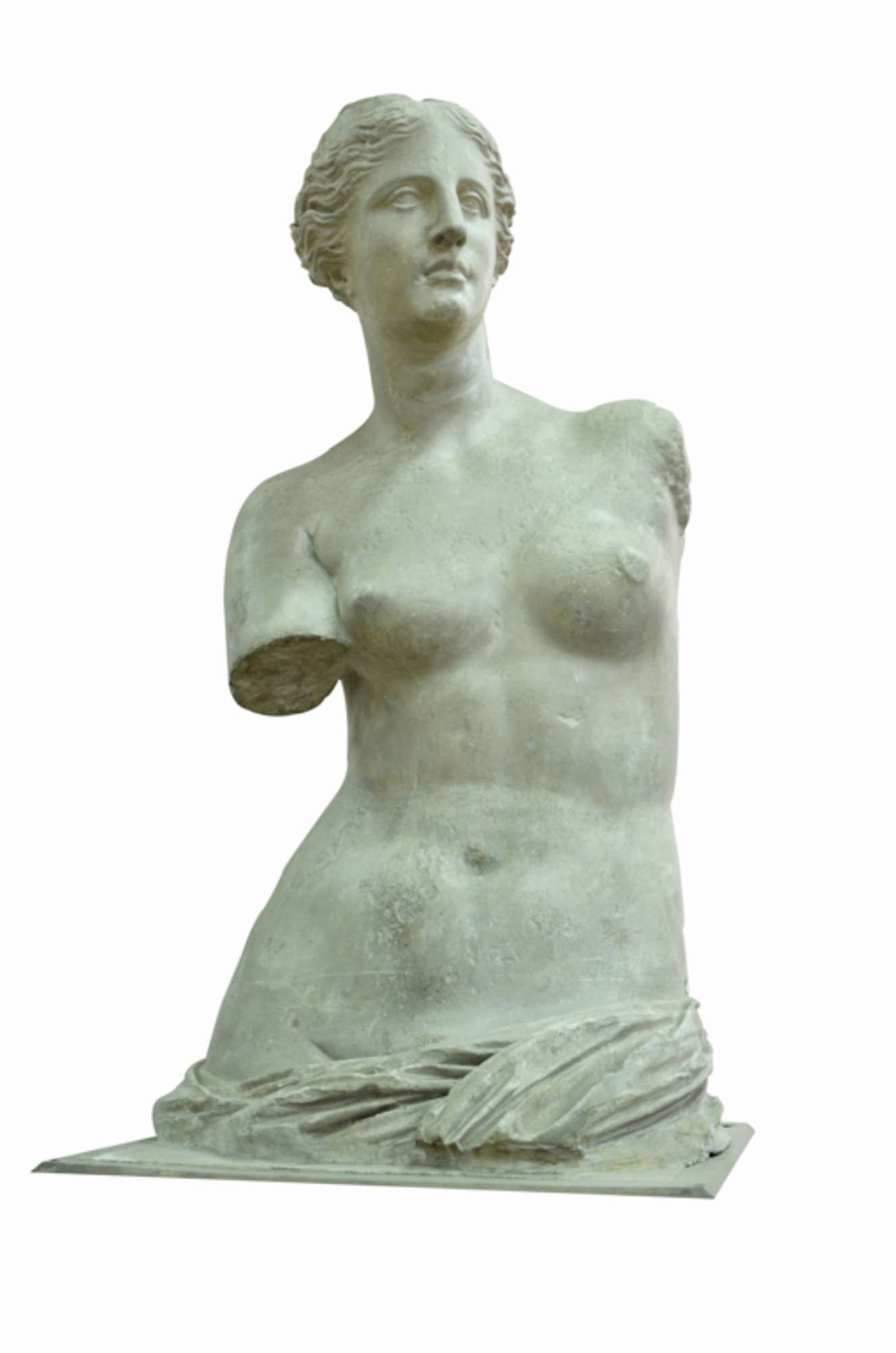 Calco parziale della Venere di Milo, raffigurante la parte superiore della statua, compresa tra la testa e il bacino. La dea è nuda, coperta da un drappo intorno al bacino. Si segnala che la statua originale è composta da due parti congiunte insieme all’altezza dei fianchi.