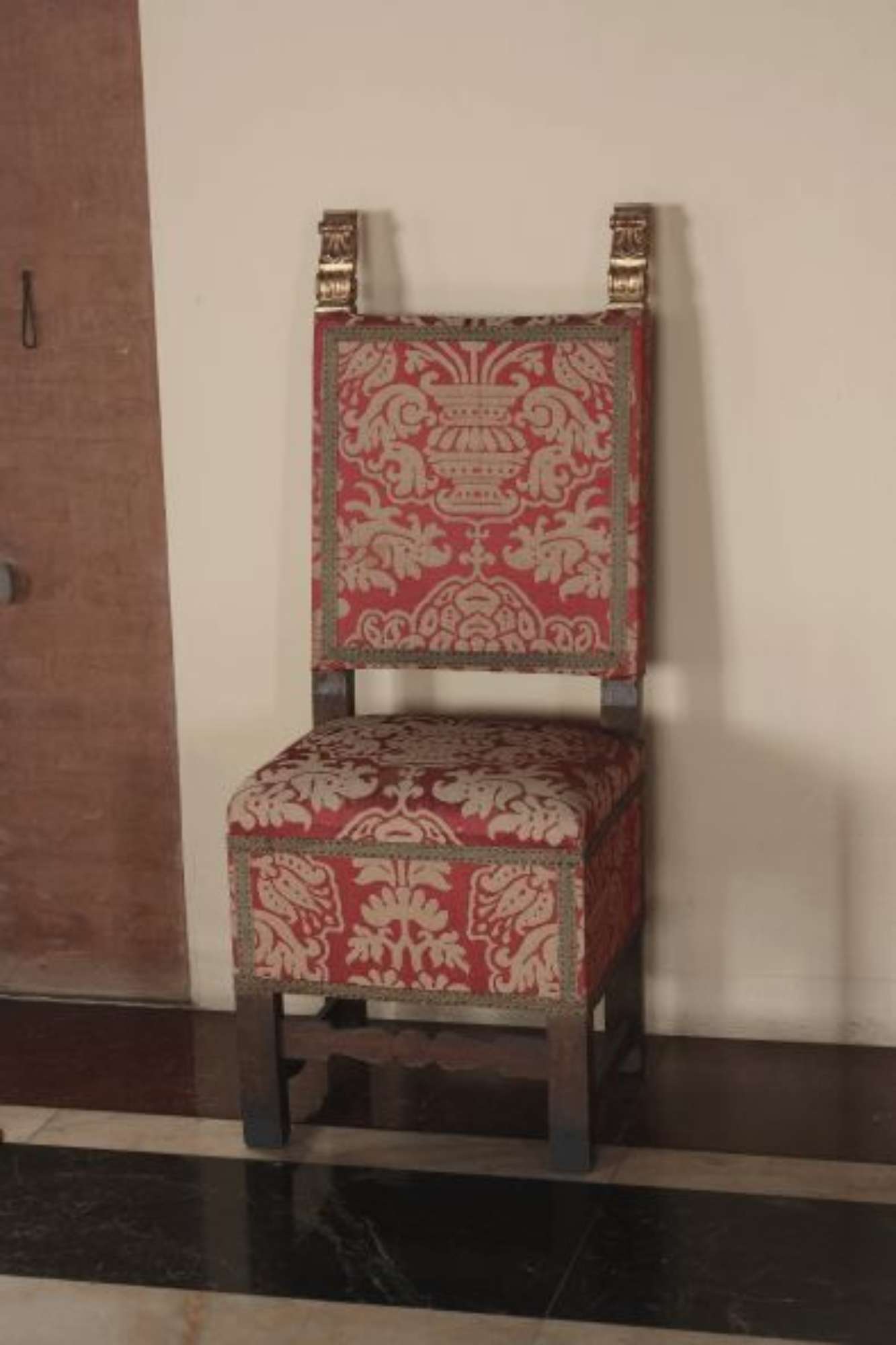 Sedia ad quattro gambe unite da traversa sagomata con sedile e schienale rivestiti in damasco rosso tono su tono; passamaneria dorata. I montanti dello schienale terminano con due fiamme intagliate e dorate. Fa parte di una serie di dodici sedie e due divani.