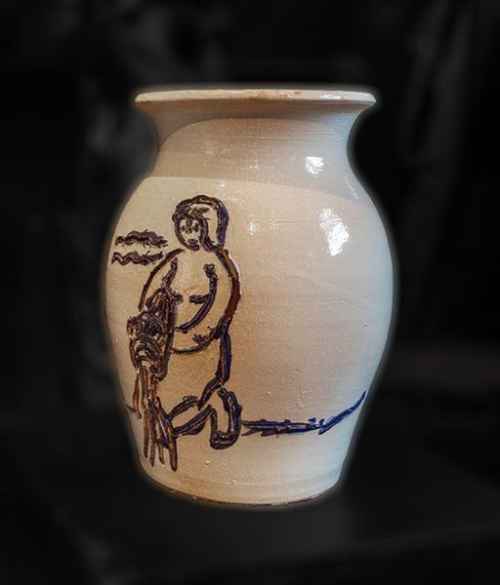 Vaso a corpo ovoidale con bassa bocca ad anello e basso piede ad anello.