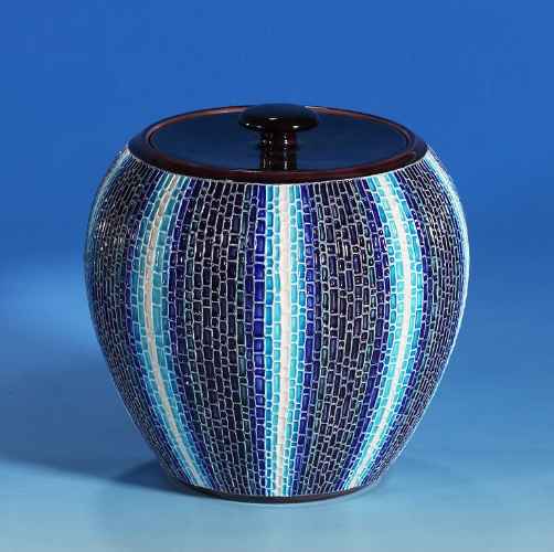 La parte superiore è decorata con sfumature di blu su fondo bianco, mentre la parte inferiore del vaso è azzurra.