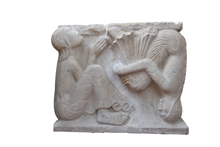 Dentro una cornice aggettante superiormente sono due figure accovacciate rappresentate di profilo e in posizione inversa. A sinistra è rappresentata una fanciulla dai lunghi capelli raccolti in una treccia, seduta in posizione rannicchiata con le gambe fra le braccia; indossa un abito lungo abbondantemente panneggiato e ha un falchetto dietro la spalla sinistra. Di fronte a lei, a destra, è una figura maschile seduta in posizione capovolta, che indossa una lunga tunica, ha una corta capigliatura coperta da una cuffia e tende la testa all'indietro.