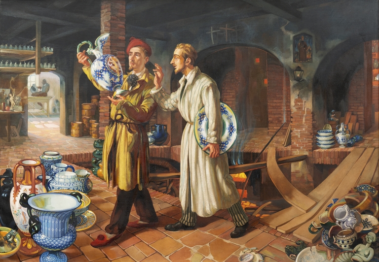 Dipinto raffigurante lo scorcio di una fornace dove si producono ceramiche. Al centro la scena è occupata dalle figure dell’eccentrico artista-ceramista, con un grosso vaso fra le mani, e del facoltoso acquirente con un grande piatto tenuto con mano e braccio sinistro accostato al fianco; in primo piano, ai due lati, sono altri manufatti ceramici; dietro si possono notare due livelli di arcate al disotto delle quali si intravede il forno. A sinistra altri manufatti allineati e, oltre il passaggio arcuato, altro ambiente di deposito o di lavorazione.