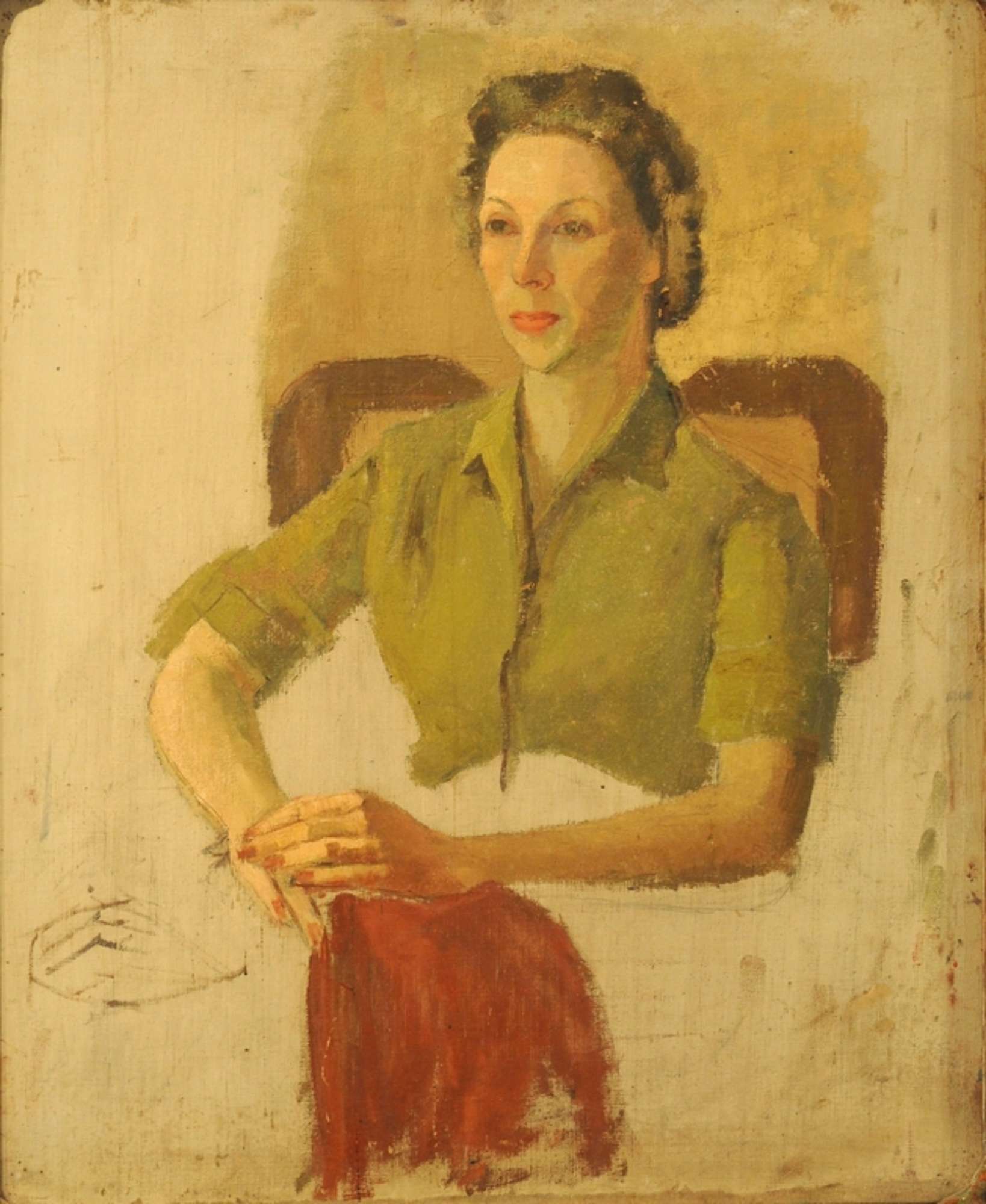 Ritratto di donna, a mezza figura e di tre quarti, seduta in poltrona. Il dipinto è a mezza via fra lo studio preparatorio ed il “non finito”: il volto ed il busto sono sostanzialmente ben definiti, la parte restante in stato di abbozzo. In basso a sinistra è anche uno studio di mani.