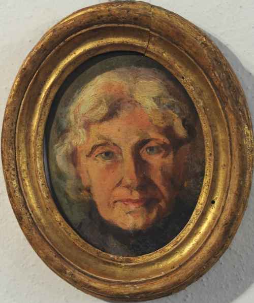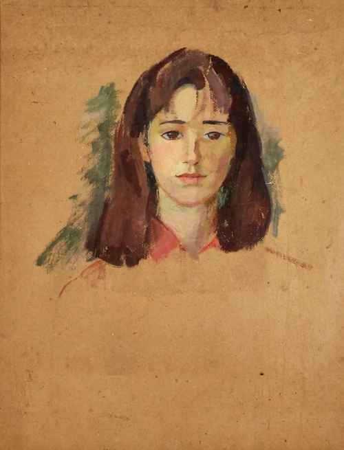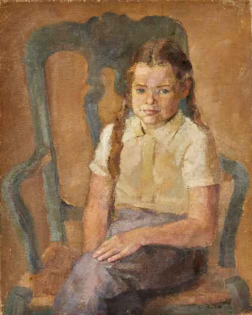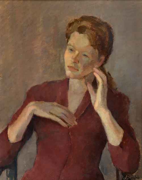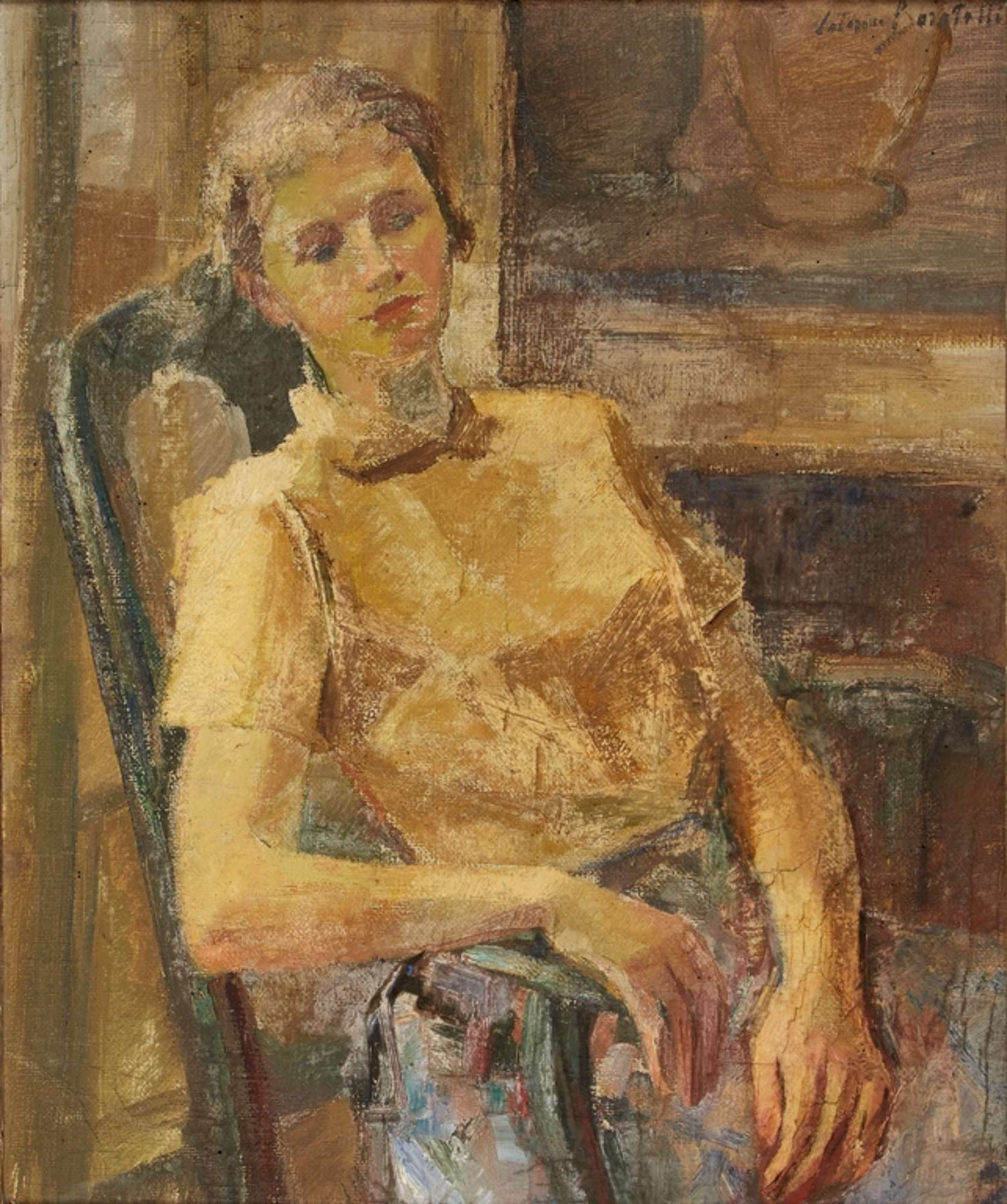 Ritratto di giovane donna in interno borghese, a mezza figura e di tre quarti, seduta in poltrona in relax, come si evince dal “rilascio” delle braccia, il destro appoggiato al bracciolo.