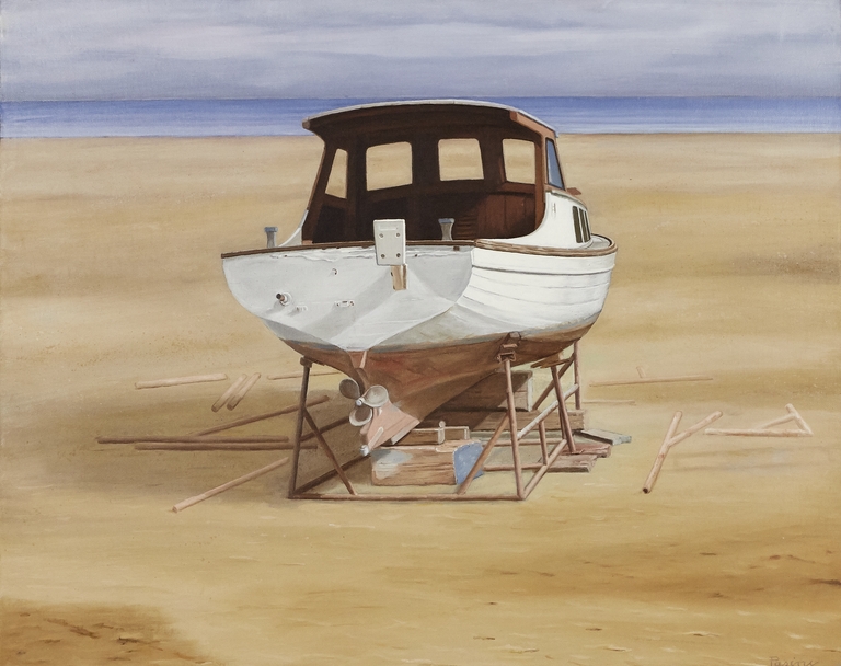 Piccola imbarcazione a motore, sostenuta da invasatura in montaggio o in dismissione, su costiera sabbiosa.