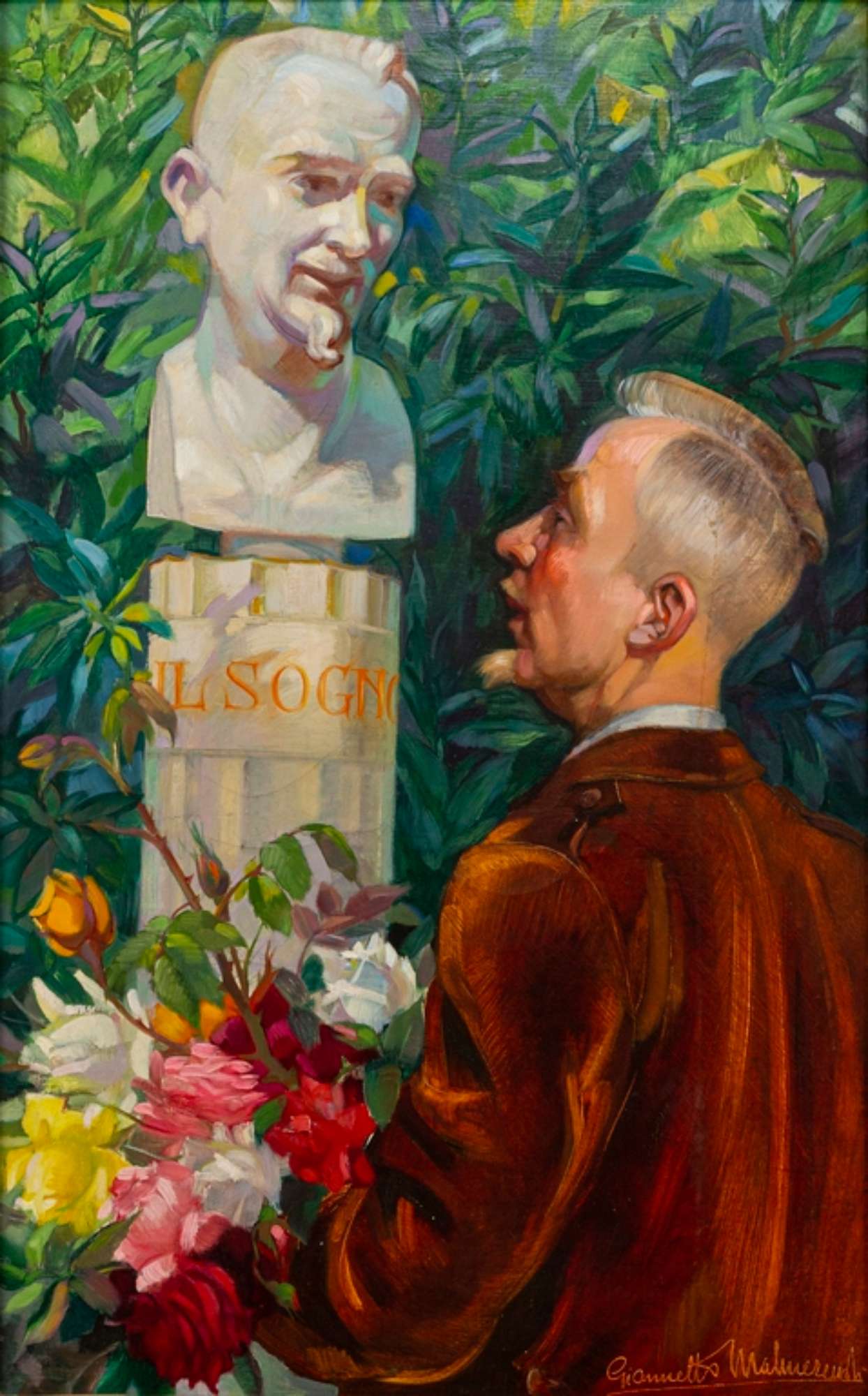 Autoritratto-sogno dell’autore, come suggerisce il titolo. Malmerendi, ritrae se stesso, di spalle a tre quarti verso sinistra, nell’atto di omaggiare con un mazzo di fiori il “proprio” mezzobusto” celebrativo.