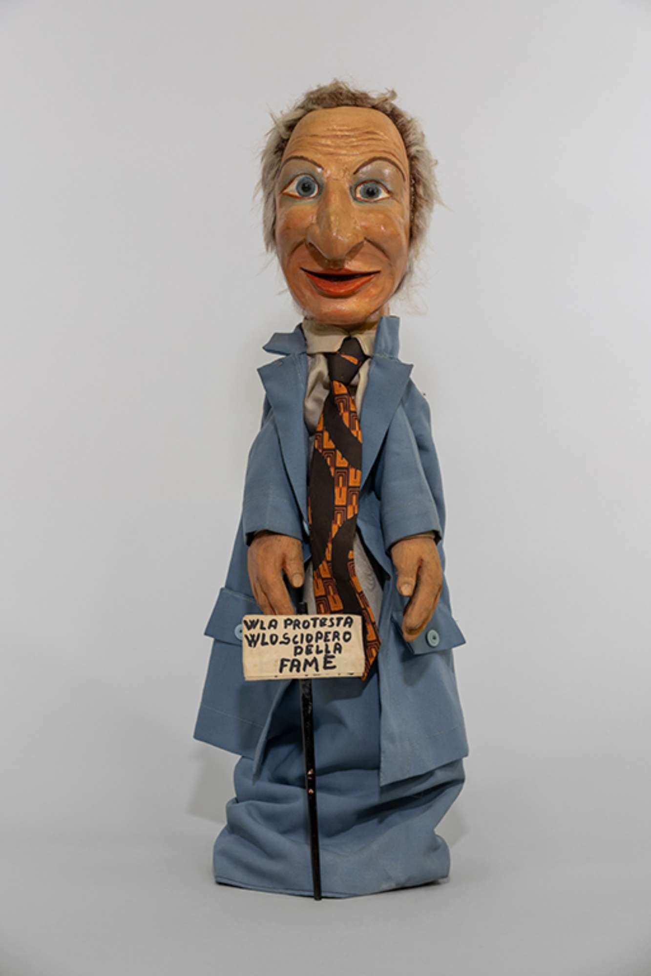 Il burattino apparteneva alla raccolta di Cesare Maletti ed è pervenuto al Museo Civico di Modena nel 2018. Esponente di una storica dinastia di burattinai modenesi, Cesare Maletti (Modena 1929-1992) iniziò verosimilmente negli anni Cinquanta a raccogliere quanto connesso col teatro delle figure animate, indipendentemente dalle scuole e dalla provenienza: burattini, marionette, pupi, scenografie, oggetti di scena, testi e documenti, compresi tra il Settecento e il Novecento. Rapporti professionali e di amicizia, da cui derivano scambi e acquisti di materiali, legavano Cesare Maletti a famiglie di burattinai e di marionettisti, tra cui Ferrari, Sarzi, Zaffardi, Colla e Vignoli, o eredi di questi come Mario Tirelli, figlio del caricaturista Umberto Tirelli, autore all'inzio degli anni Venti del Teatro Nazionale delle Teste di Legno. Raggruppata sotto il nome di "Teatro delle Maschere", la raccolta fu allestita presso il suo museo-laboratorio in Via Livizzani 38 a Modena (cfr. “I burattini dei Maletti”, Modena 1983 [1984]), condotto assieme al figlio Mario (Modena 1947-2019), con cui nel 1970 fondò una compagnia che ottenne successi nazionali, in particolare con lo spettacolo "Fantasia per un burattino". Di Cesare si ricordano la versatilità con cui dava i movimenti e le voci ai vari personaggi, anche femminili, i rintocchi di campanella con cui apriva le rappresentazioni, e la loro chiusura con un'allegra filastrocca dialettale tramandata in famiglia. Creatore egli stesso dei suoi burattini assieme al figlio e alla moglie Liliana Bestagno a cui spetta la realizzazione dei costumi, Cesare Maletti collaborava anche con istituzioni pubbliche, dando vita ad un'intensa attività espositiva e didattica rivolta alle scuole. Il burattino raffigura Marco Pannella e appartiene a una serie di caricature di politici italiani realizzata da Cesare e Mario Maletti all’inizio degli anni ottanta del secolo scorso. Questi burattini furono realizzati per essere esposti nelle mostre dedicate alla raccolta di Maletti e non per agire in uno spettacolo. Essi sono rivelatori dei legami del burattinaio con Mario Tirelli.