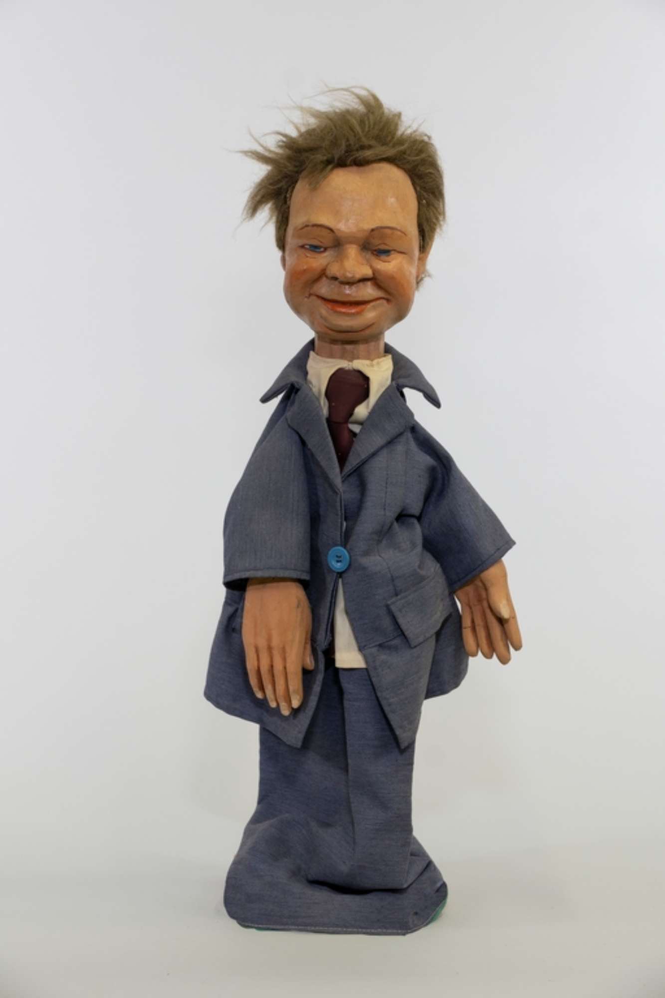 Burattino con testa e mani scolpite e dipinte. I capelli sono di materiali sintetico. L’abito, la camicia e la cravatta sono di cotone. Il bottonedella giacca è di plastic azzurra.