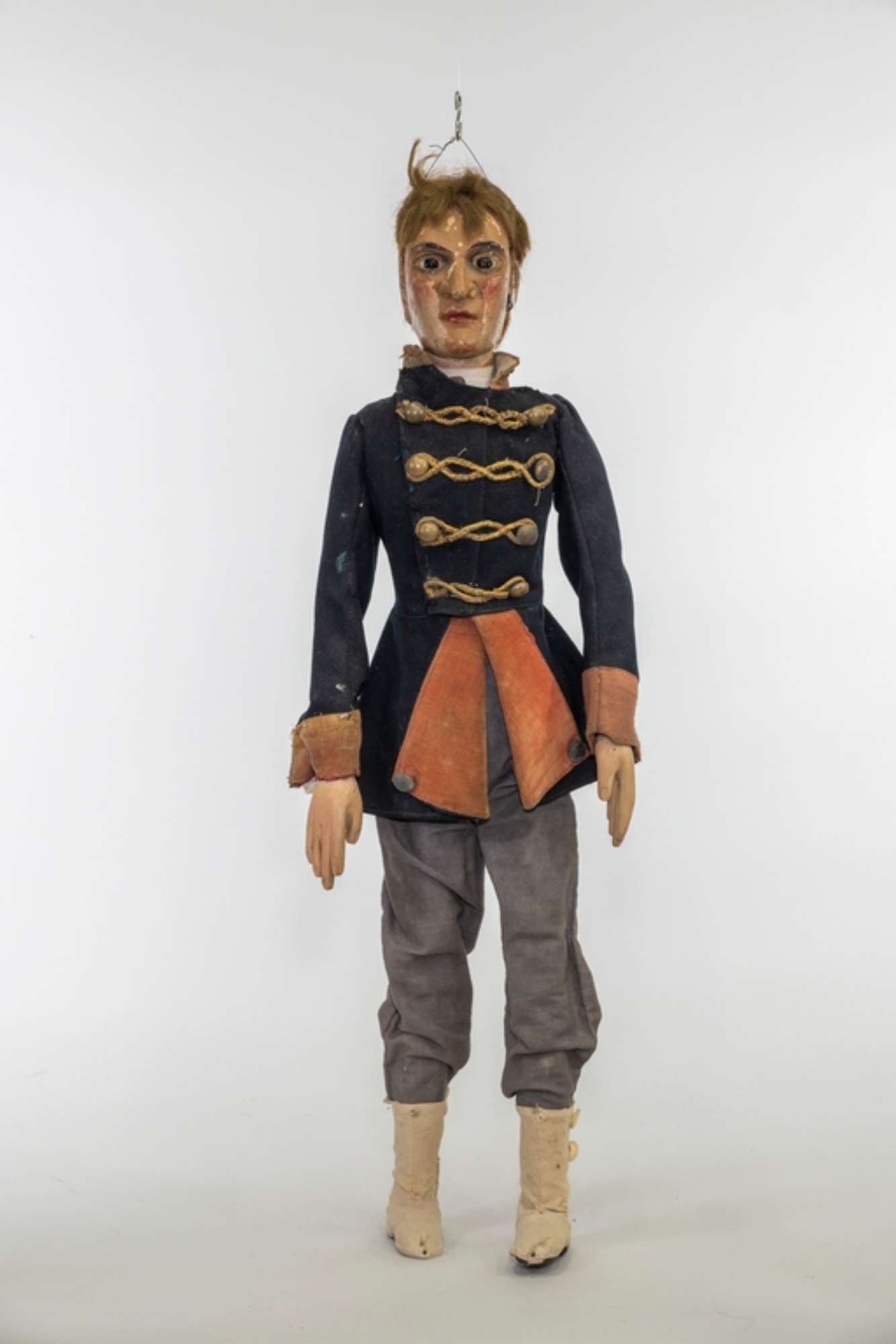 La testa e le mani sono di legno scolpito e dipinto. Il corpo e le gambe sono di legno sagomato e scolpito. Gli occhi sono di vetro. I capelli sono veri. L’abito è di panno blu, con alamari e bottoni dorati. I pantaloni sono di cotone grigio. Gli stivali sono di cotone bianco.