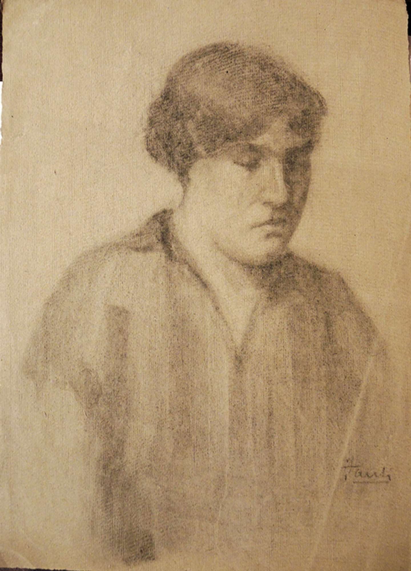 Ritratto di donna a mezzo busto, con il volto abbassato e gli occhi socchiusi; indossa una veste scura.