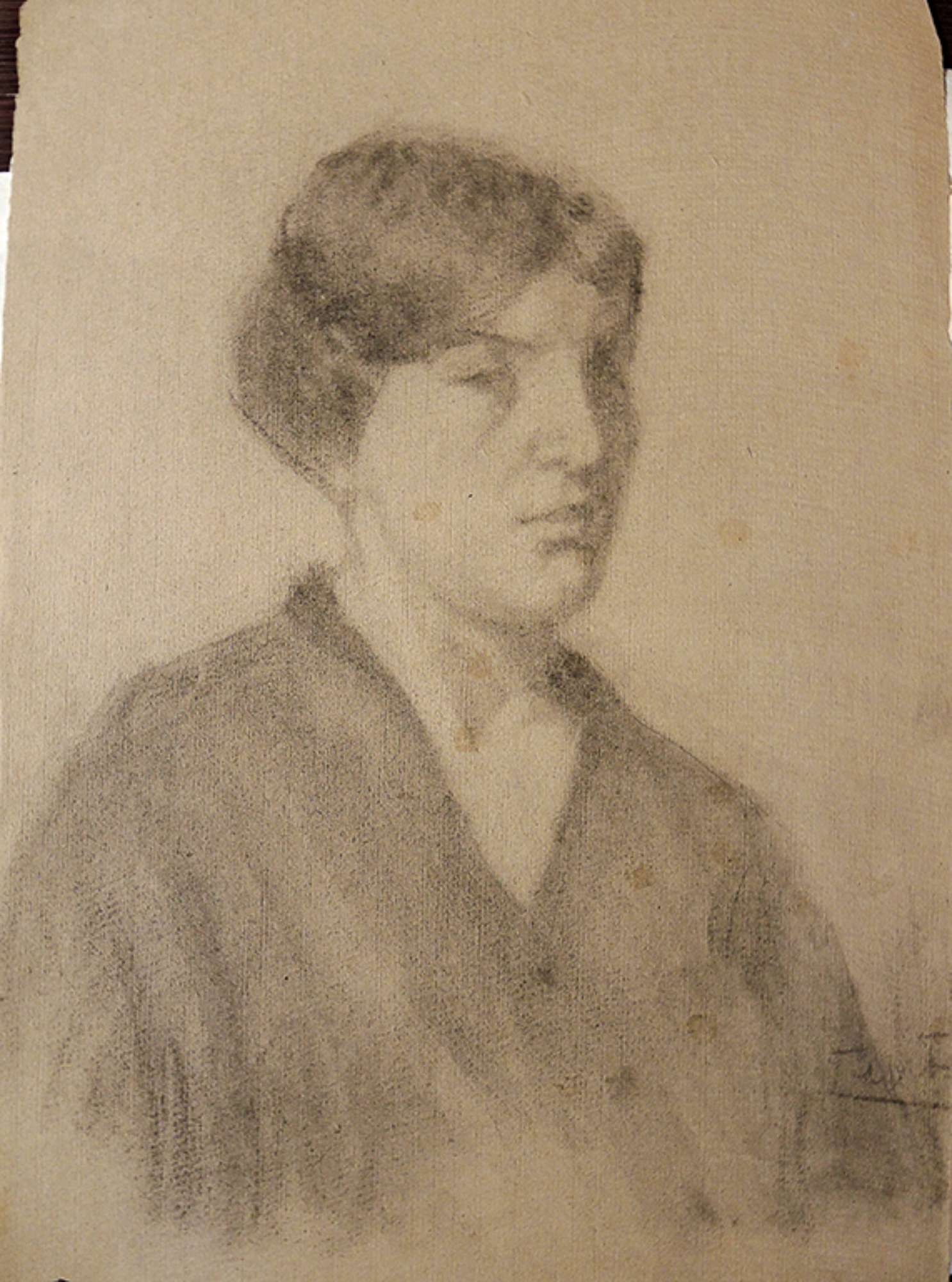Ritratto femminile a mezzobusto; la donna indossa una veste scura e porta