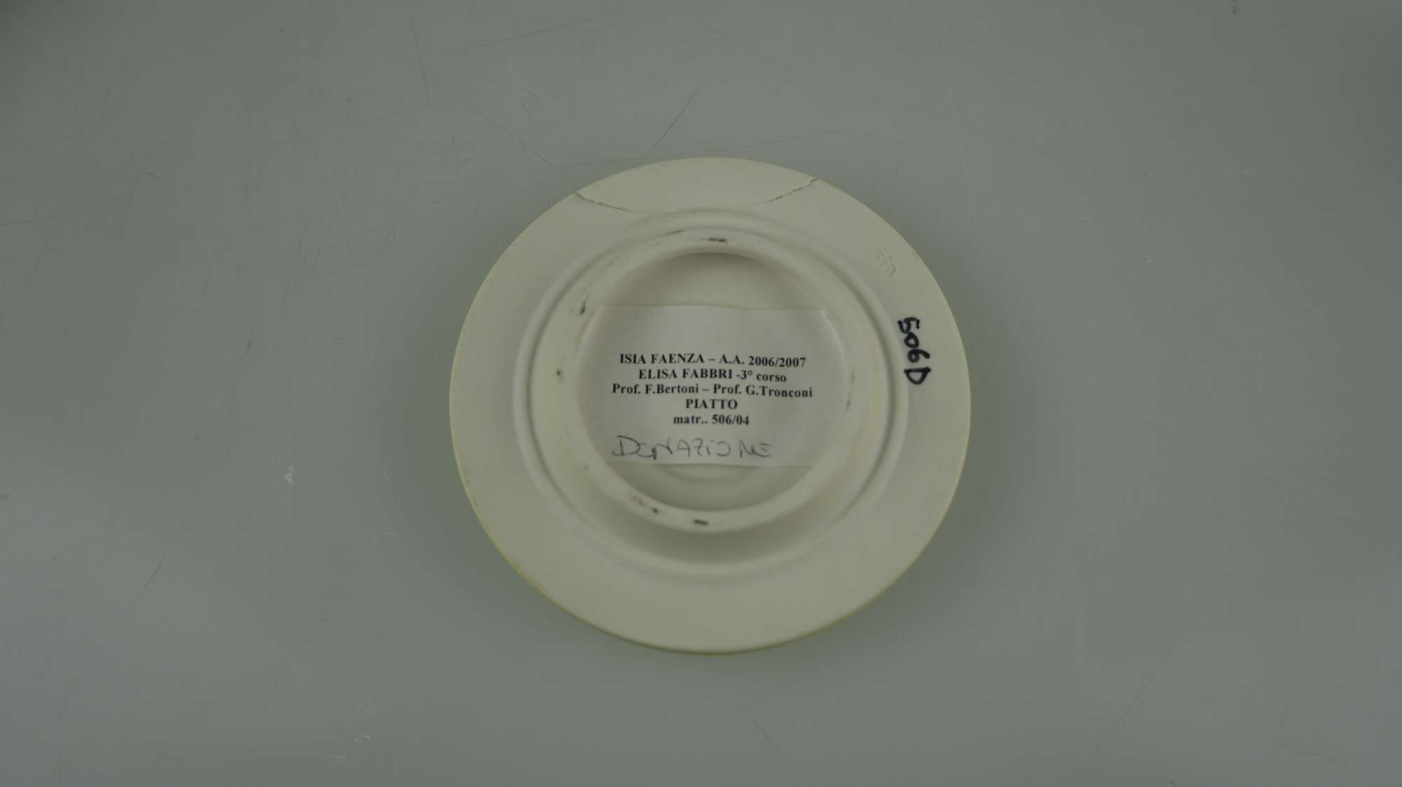 Trascrizione: 506D Etichetta: ISIA FAENZA – A.A. 2006/2007 Elisa Fabbri 3° corso Prof. F. Bertoni – Prof. G. Tronconi PIATTO Matr.. 506/04 Donazione