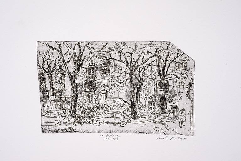 Uno scorcio di una strada trafficata e sullo sfondo il prospetto della facciata dell'Accademia di Belle Arti di Firenze.