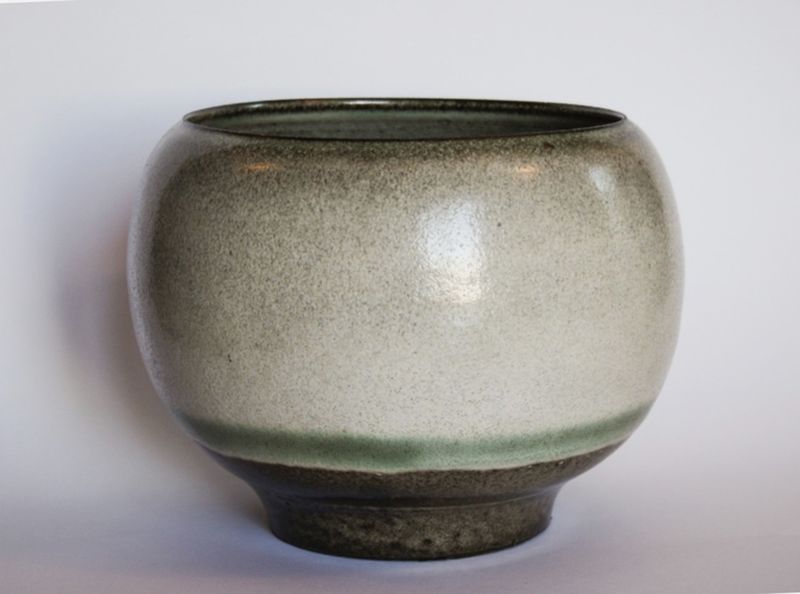 Ciotola a coppa in grès con smalto di fondo chiaro e bocca con bordo che si richiude verso l’interno. Lo smalto avorio chiaro sfuma verso il bruno verso l’alto della forma, mentre è completamente assente nella parte bassa e sul piede poco prima di arricchirsi con una fascia verde.