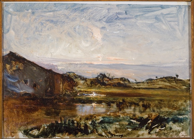 Tramonto su una palude con un casolare accanto, manca completamente il disegno, tutto è costruito dal colore e dal gesto della spatola.