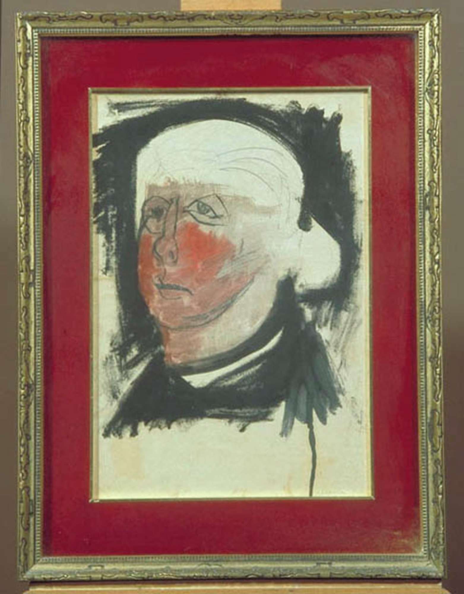 Volto tracciato a carboncino e riempito con pennellate di colore rosso.
