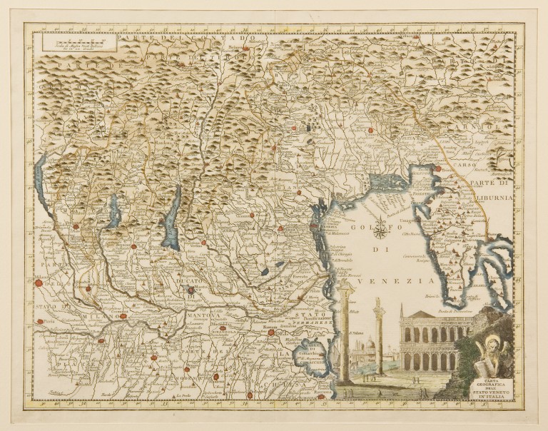 Carta geografica dello Stato Veneto. Nella parte destra scorcio della piazzetta San Marco con la Libreria Marciana. Nell'angolo in basso a sinistra il leone di San Marco.