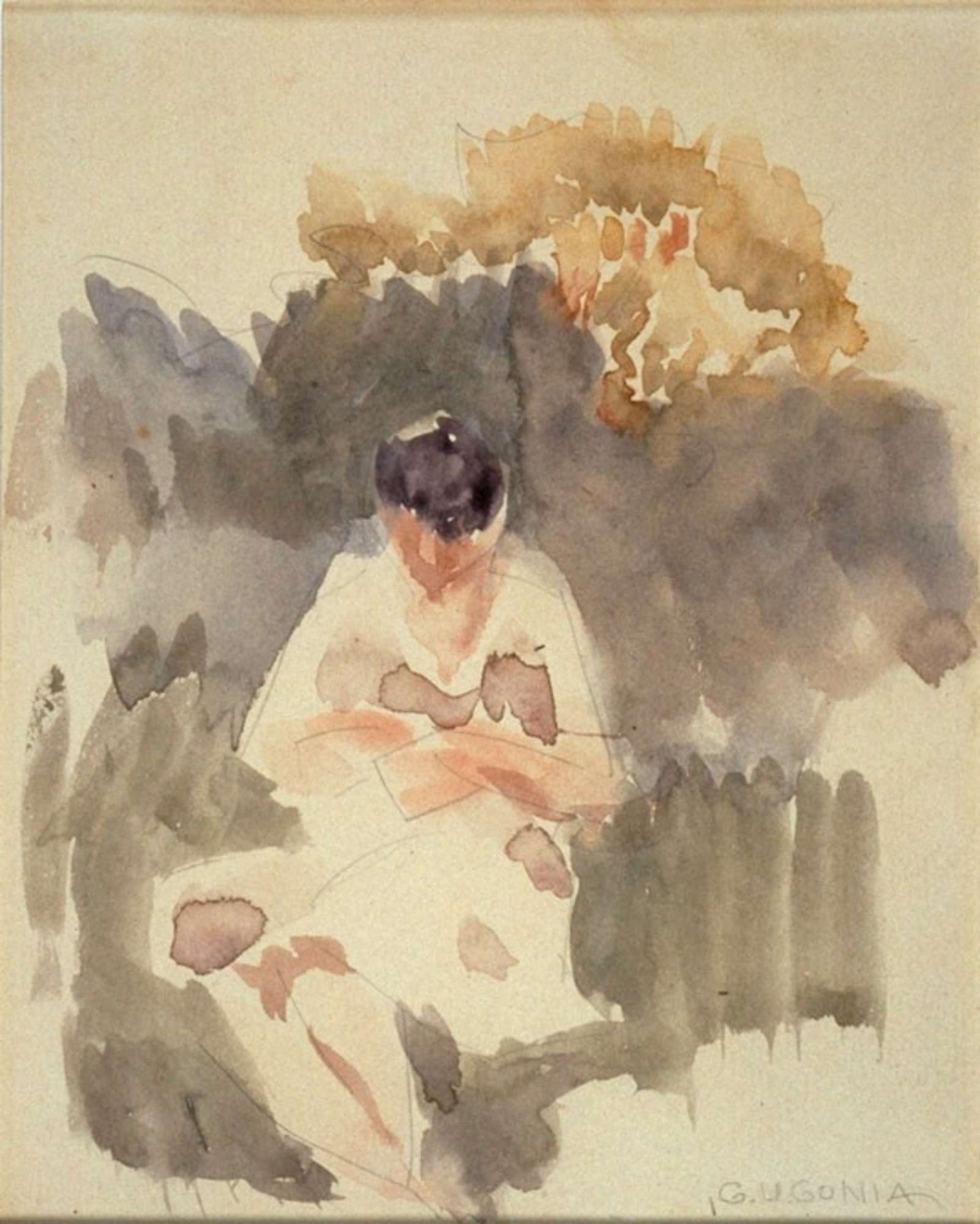L'arrivo della seconda figlia (1922), dopo la morte della primogenita Miriam, appena nata, fu un evento che non solo riempì di gioia Ugonia, ma ne rinfrancò poco dopo anche l'ispirazione artistica. Il 4 maggio 1924 l'artista scrive all'amico Sapori: "Elena è nel prato che ride alla piccina e le fanno corona la tiritera interminabile dei grilli e i canti degli usignoli. Penso a te anche in questo, perché non so dove potresti trovare meglio per sognare". Nei mesi immediatamente seguenti alla nascita della piccola, Ugonia si dedicò alla famiglia e la produzione pare meno concentrata e più rilassata, "Maternità" per esempio si distacca dagli acquerelli consueti, ponendo il paesaggio come sfondo e una figura immagine come protagonista. La figura di Elena è accennata con pennellate fluide e veloci, mentre la produzione della neonata è solo suggerita dalla posizione delle braccia della madre.