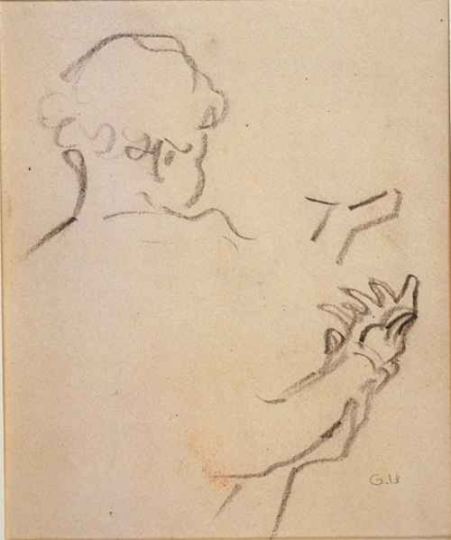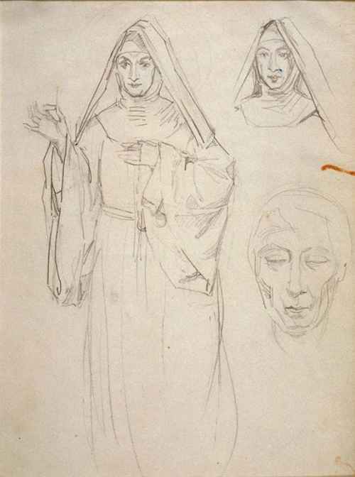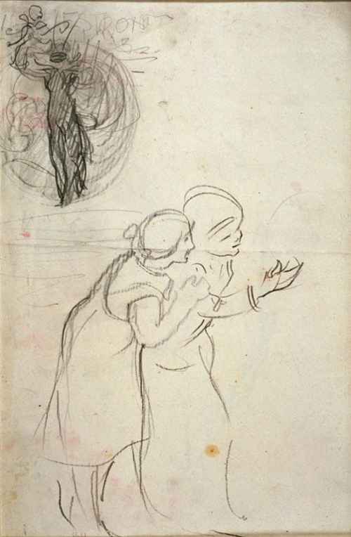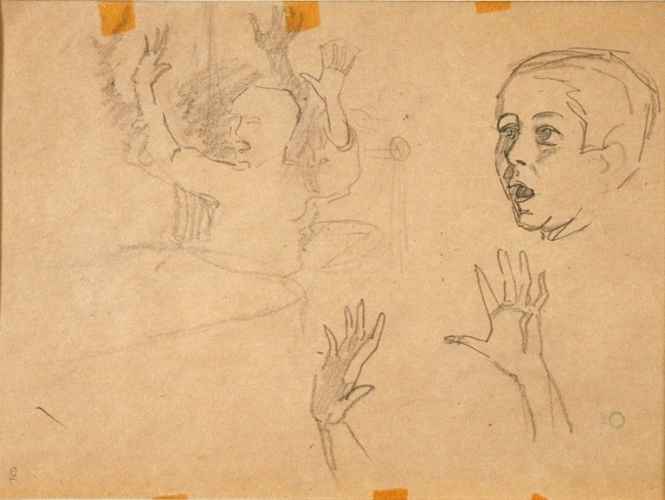 Litografia in bianco e nero su carta. L'opera raffigura un uccello che ciba i suoi piccoli in un campo di grano; croce nello sfondo.