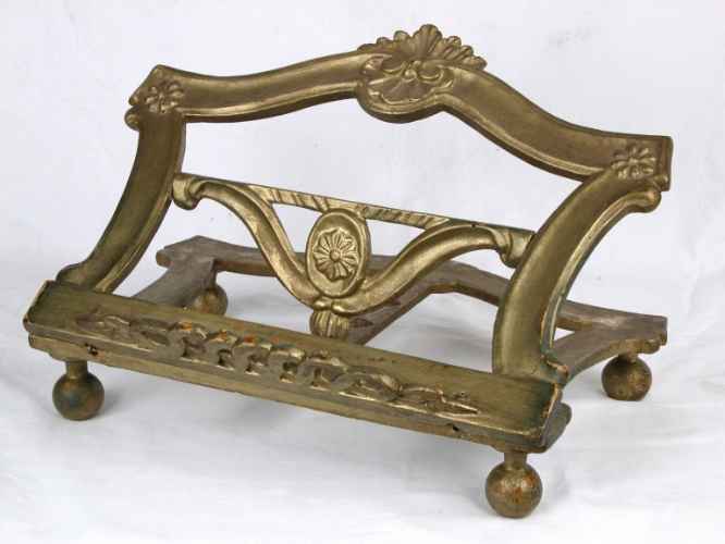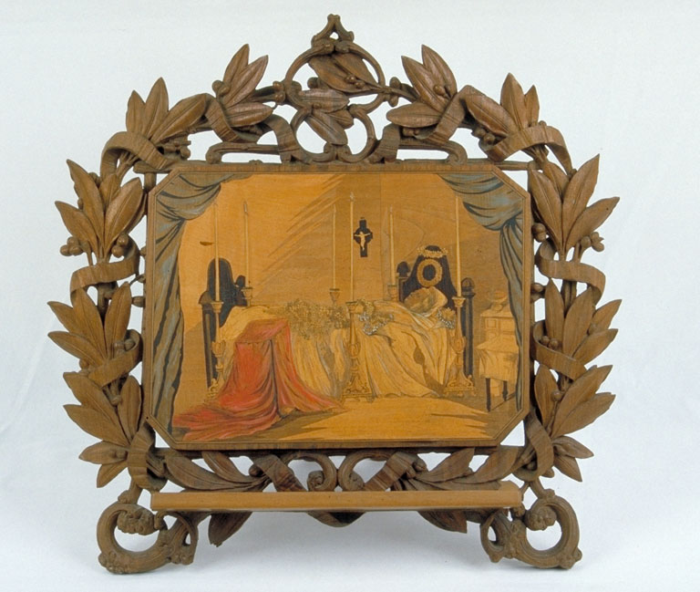 Leggio di legno di noce scolpito con foglie di alloro. Frontalmente è riportato un grande intarsio policromo che raffigura il baritono Tamburini Antonio sul letto di morte.